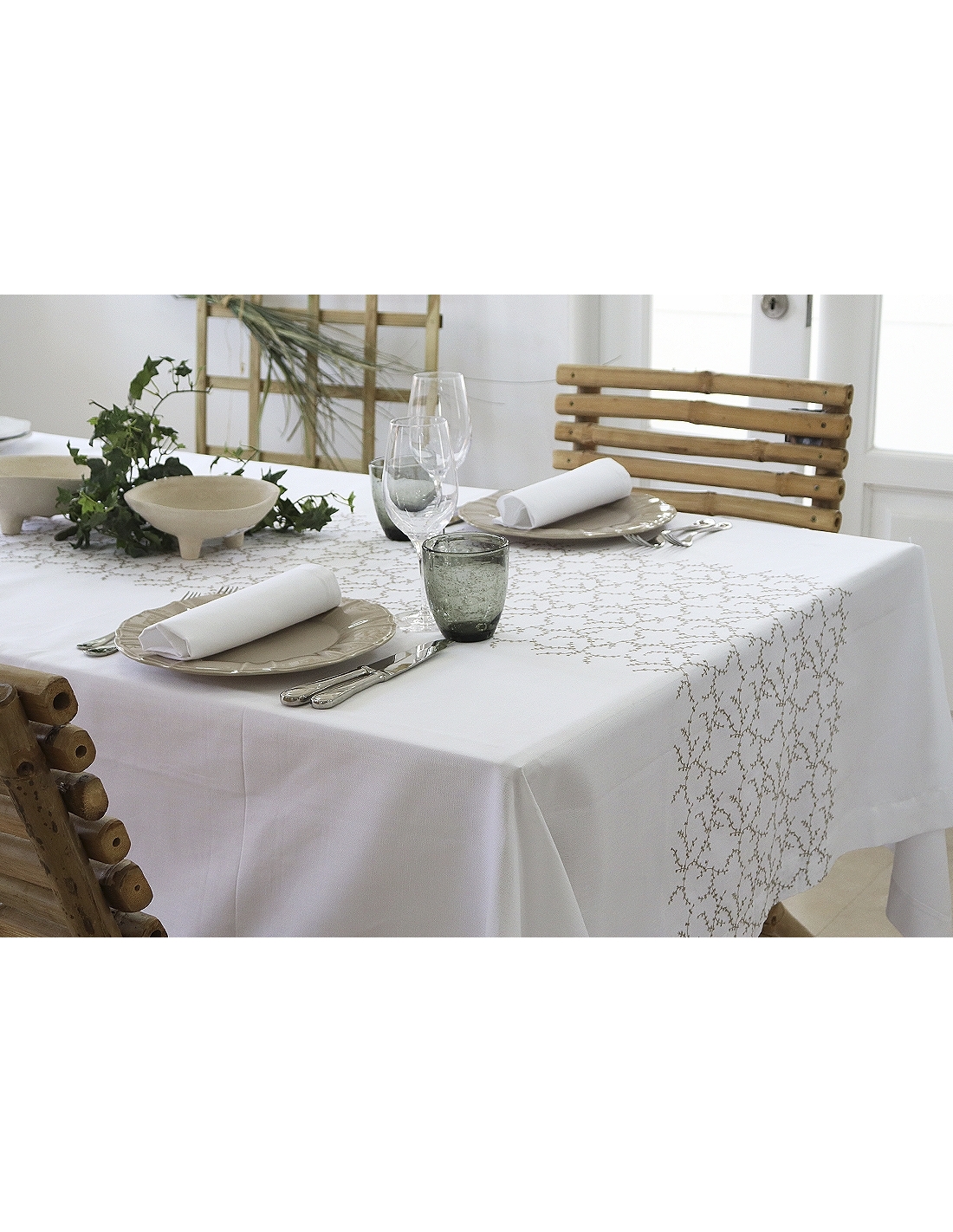 Nappe avec broderie colorée au centre, sur toute la longueur, formant un effet chemin de table.