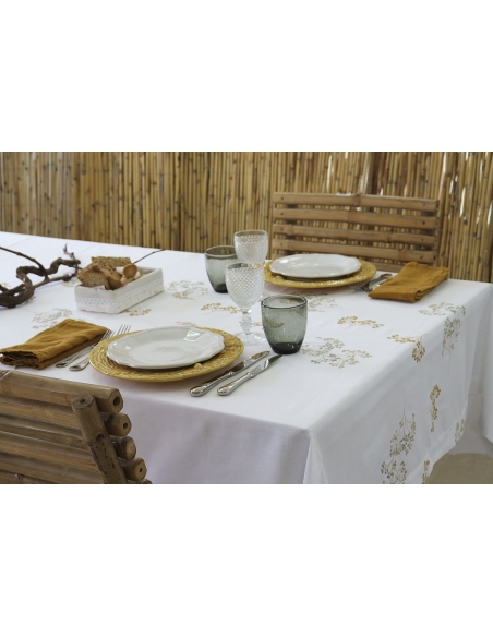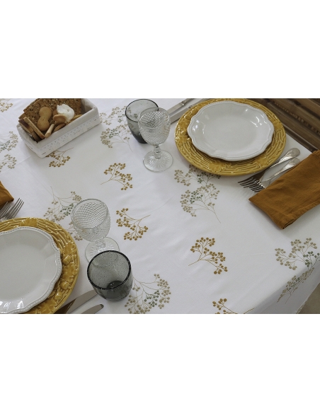 Nappe avec broderie colorée au centre, sur toute la longueur, formant un effet chemin de table.