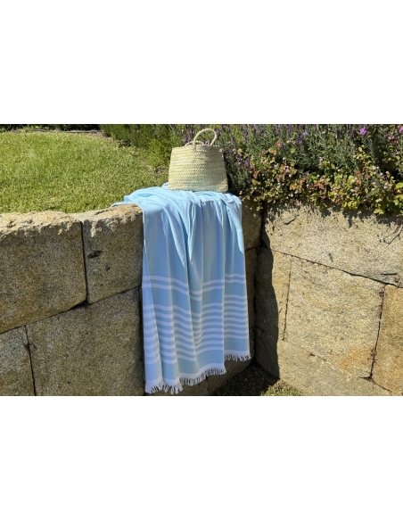 Serviette de plage de type paréo avec intérieur en tissu éponge. L'intérieur en éponge lui confère une bonne capacité d'absorption de l'eau et son tissu fin en coton le rend doux au toucher, confortable et sèche rapidement.