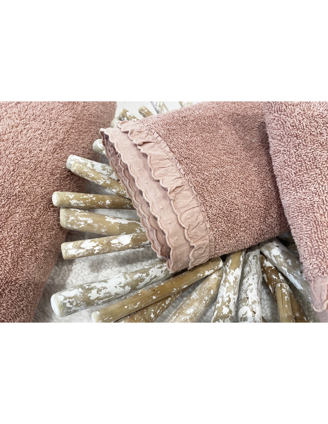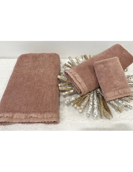 Ensemble de serviettes en tissu rose éponge avec broderie anglaise sur la pointe et finition stonewash.