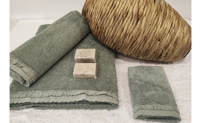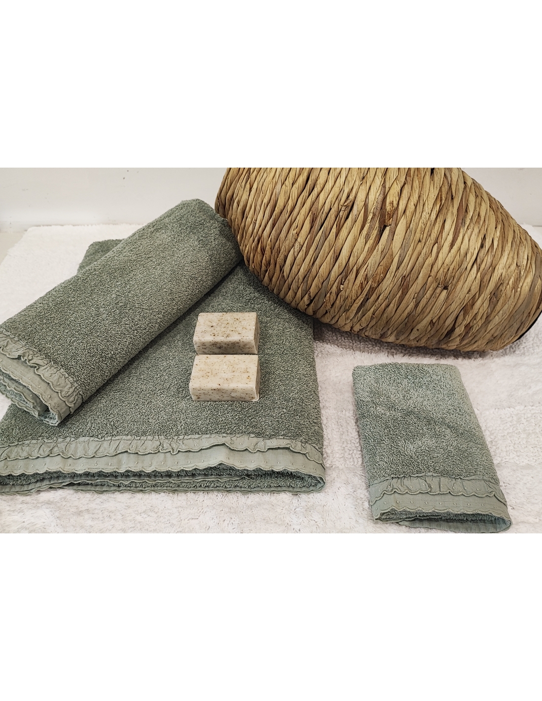 Ensemble de serviettes avec broderie anglaise sur la pointe et finition stonewash.