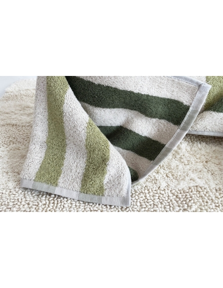 Ensemble de serviettes en coton de haute qualité, réversibles avec de larges rayures dans des tons de vert et de beige qui ajoutent une touche naturelle et contemporaine à la salle de bain.