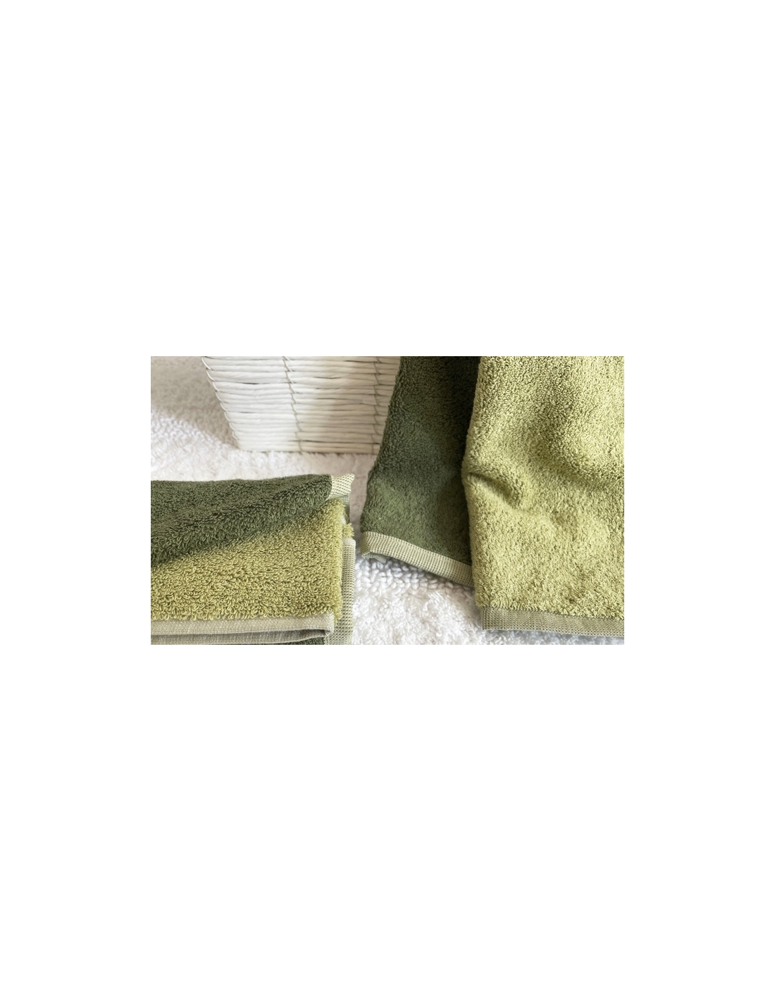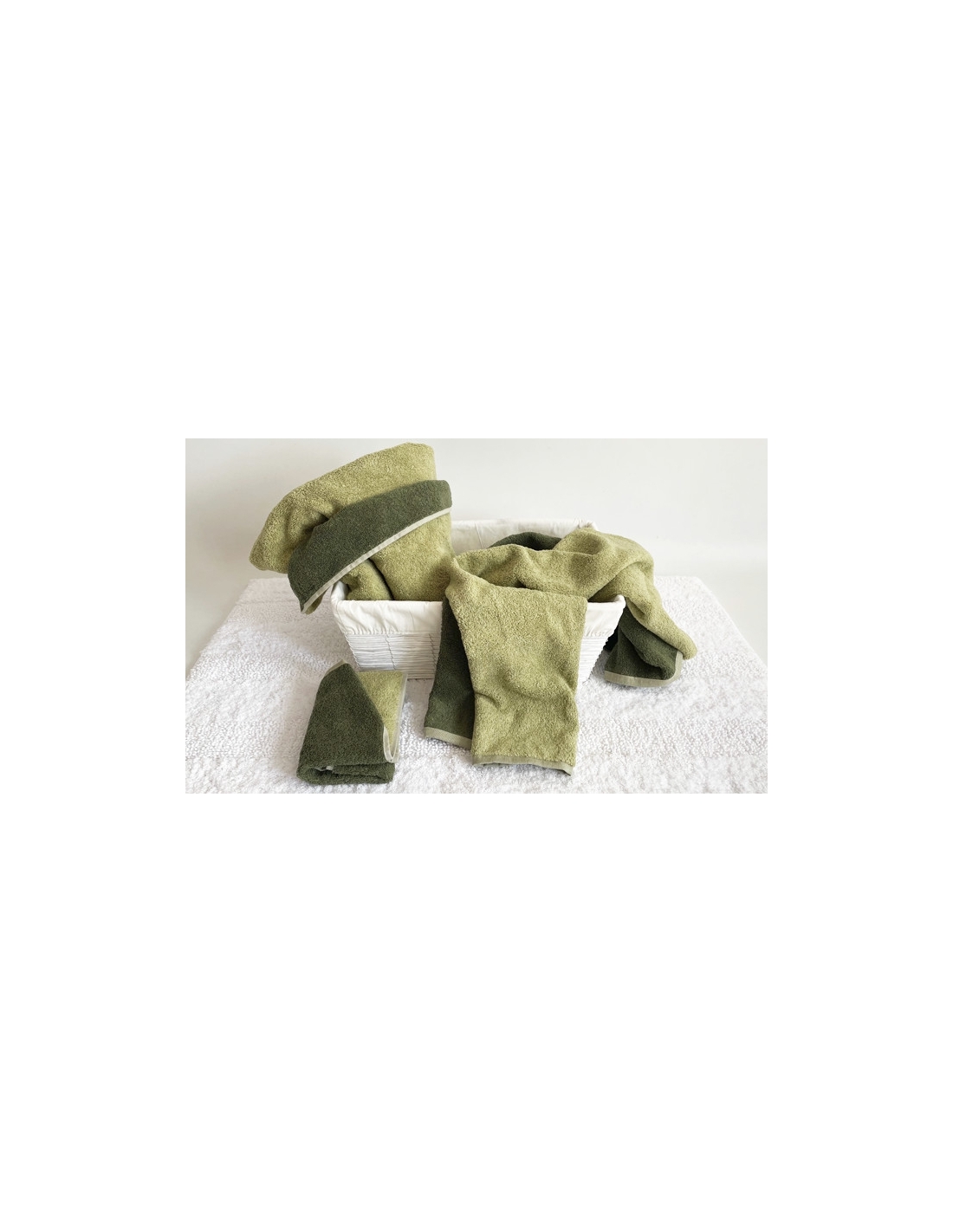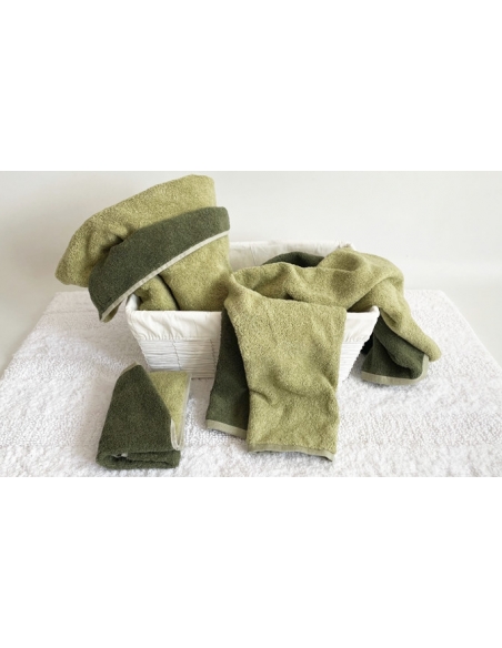 Ensemble de serviettes en coton de haute qualité, réversibles avec de larges rayures dans des tons de vert et de beige qui ajoutent une touche naturelle et contemporaine à la salle de bain.