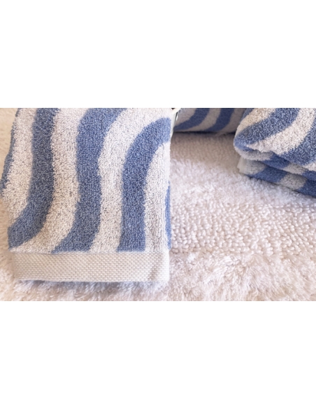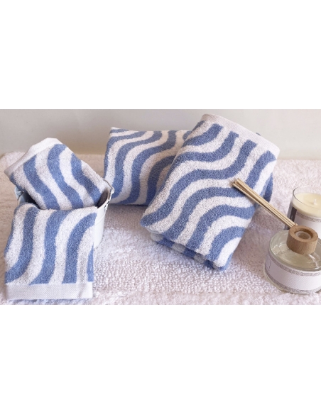 Ensemble de serviettes en coton doux et absorbantes, ornées d'un motif ondulé fluide qui apporte une touche de fraîcheur et de modernité à la salle de bain.
