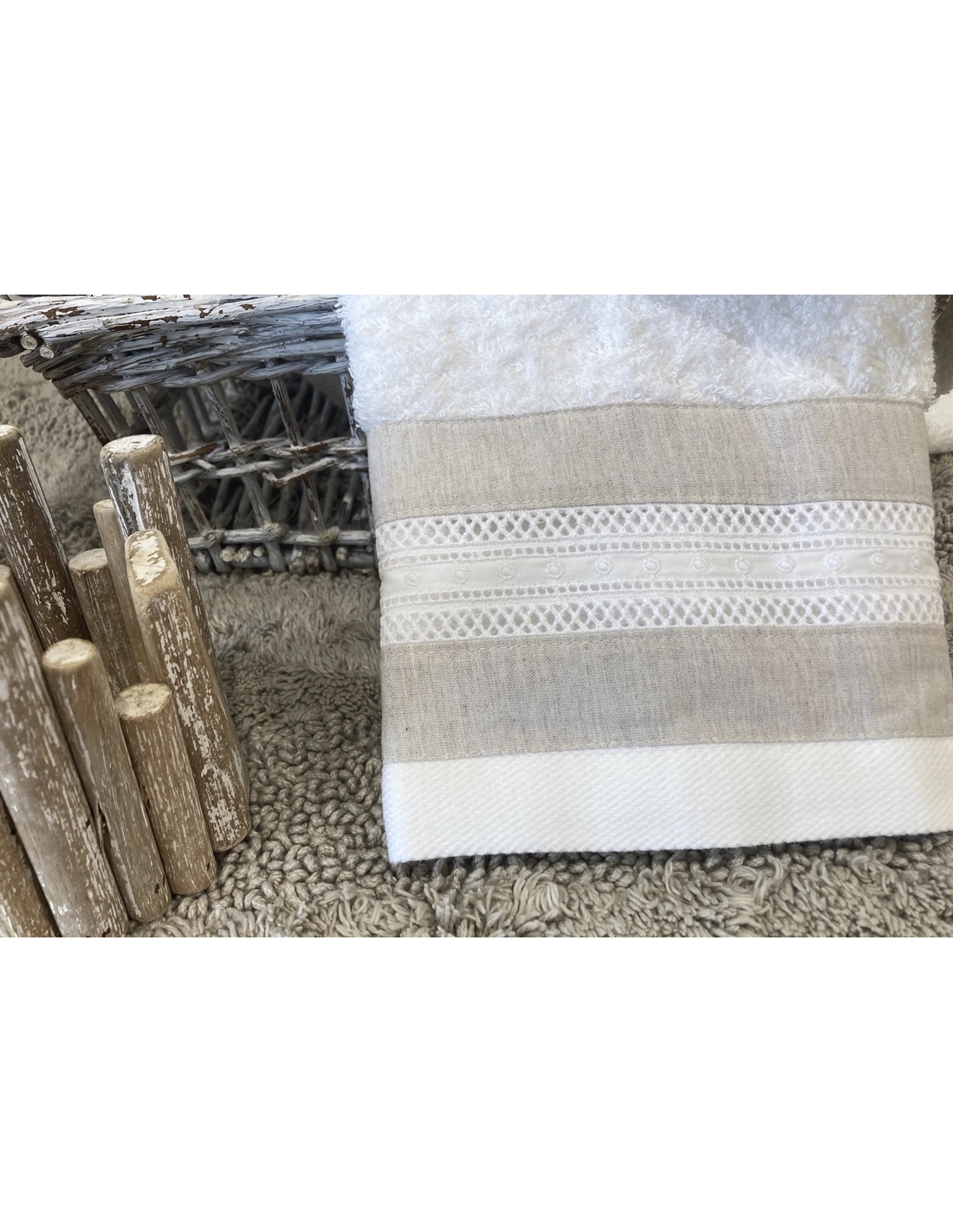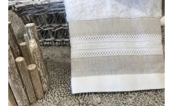 Ensemble de serviettes avec application de deux bandes de tissu avec broderie au milieu.