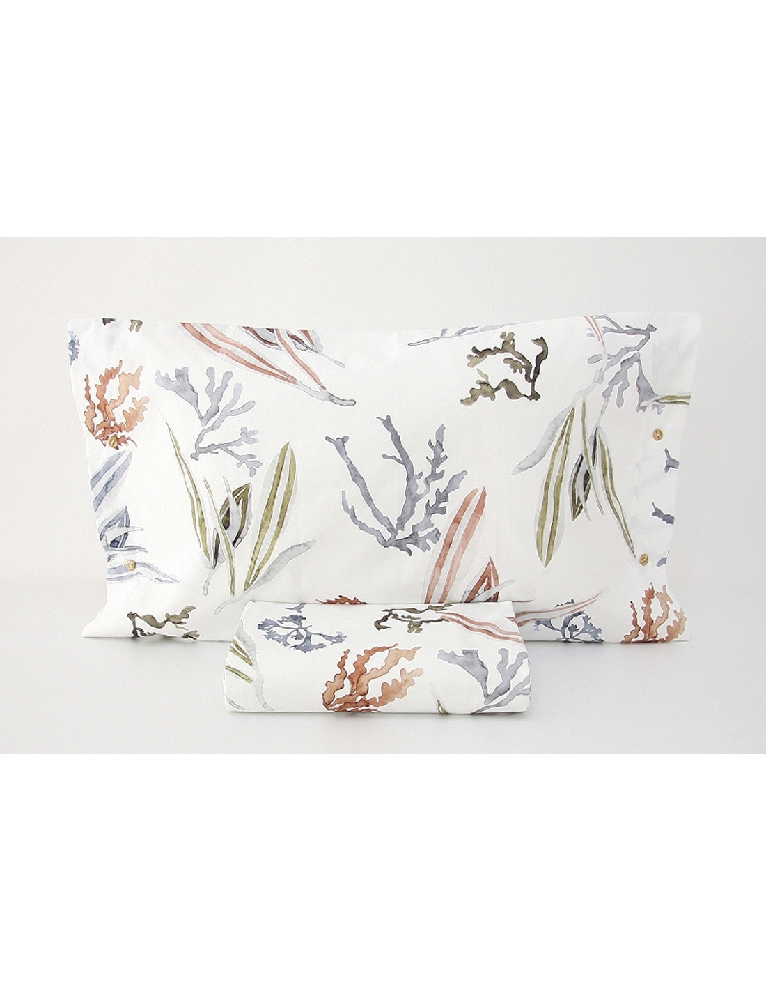 Saco de edredão com desenho estampado e avesso liso branco, assim como as respetivas almofadas. Permite dormir com o lado liso e decorar com o lado estampado.