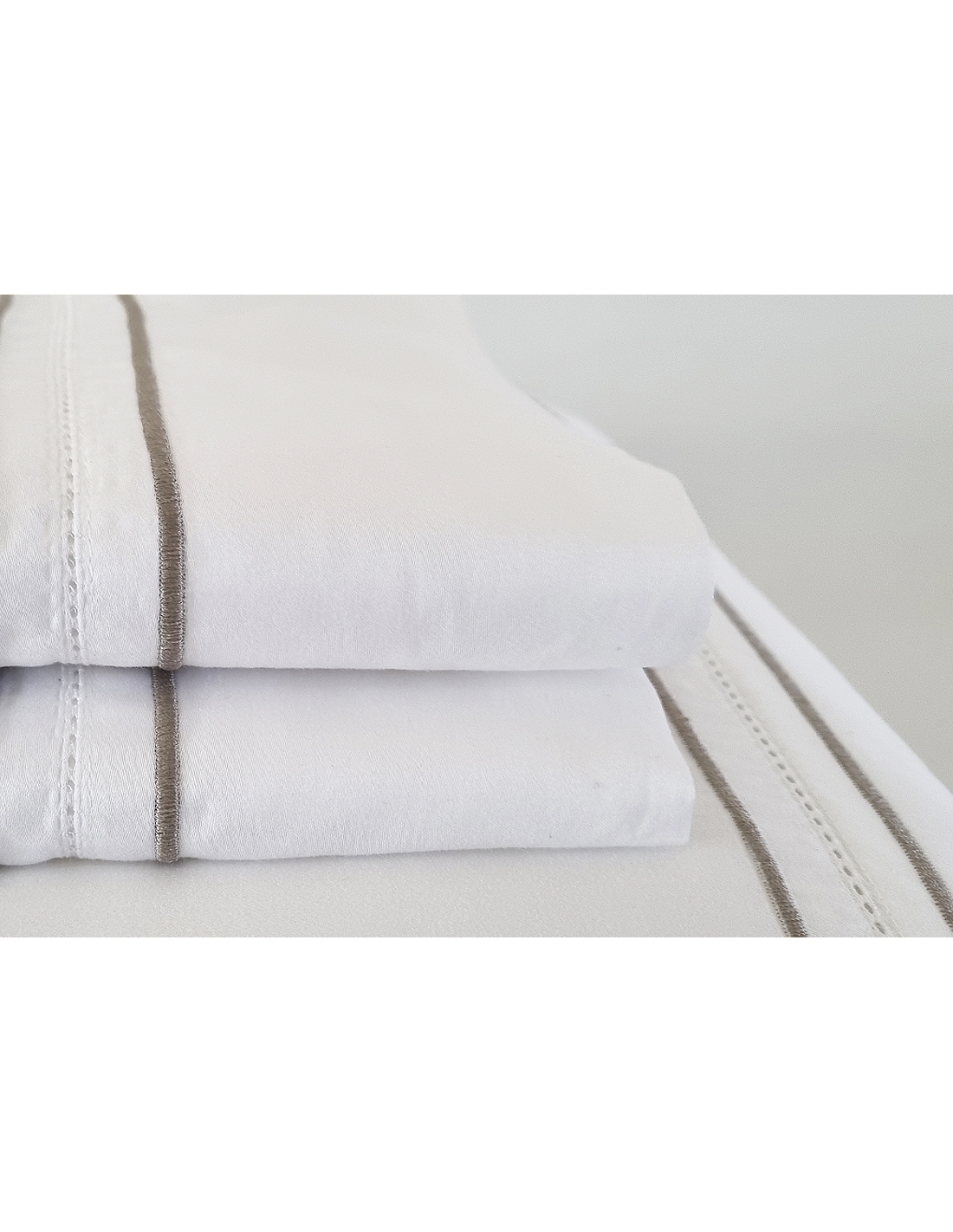 Lençol de cima e almofadas com aplicação de entremeio. As almofadas têm aplicação nos dois lados e fecham com duas abas.