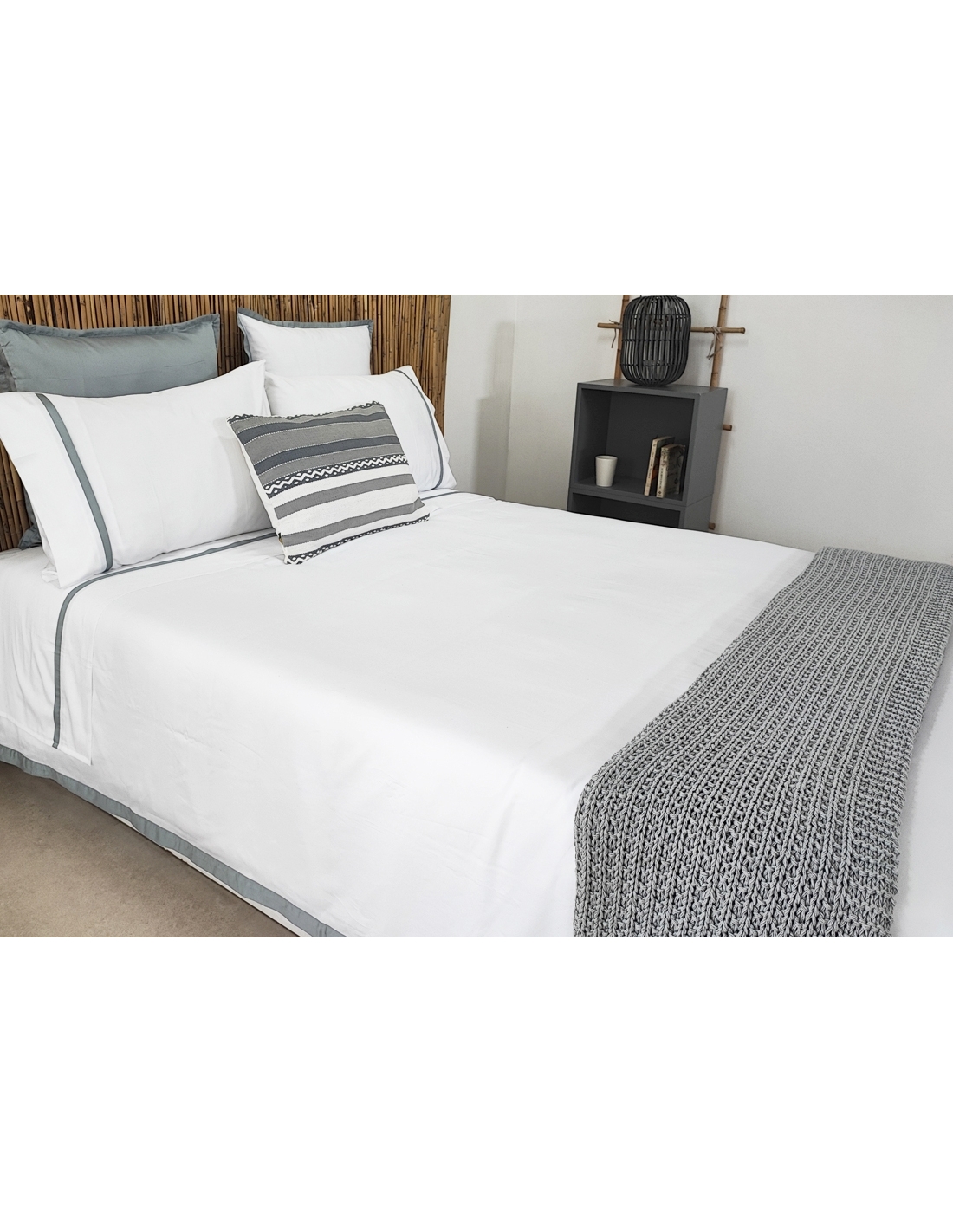 Saco de edredão reversível, com aba de cor de 3,5cm nos quatro lados, e liso na parte interior. As almofadas têm aplicação de cor num dos lados e fecham com uma aba.
