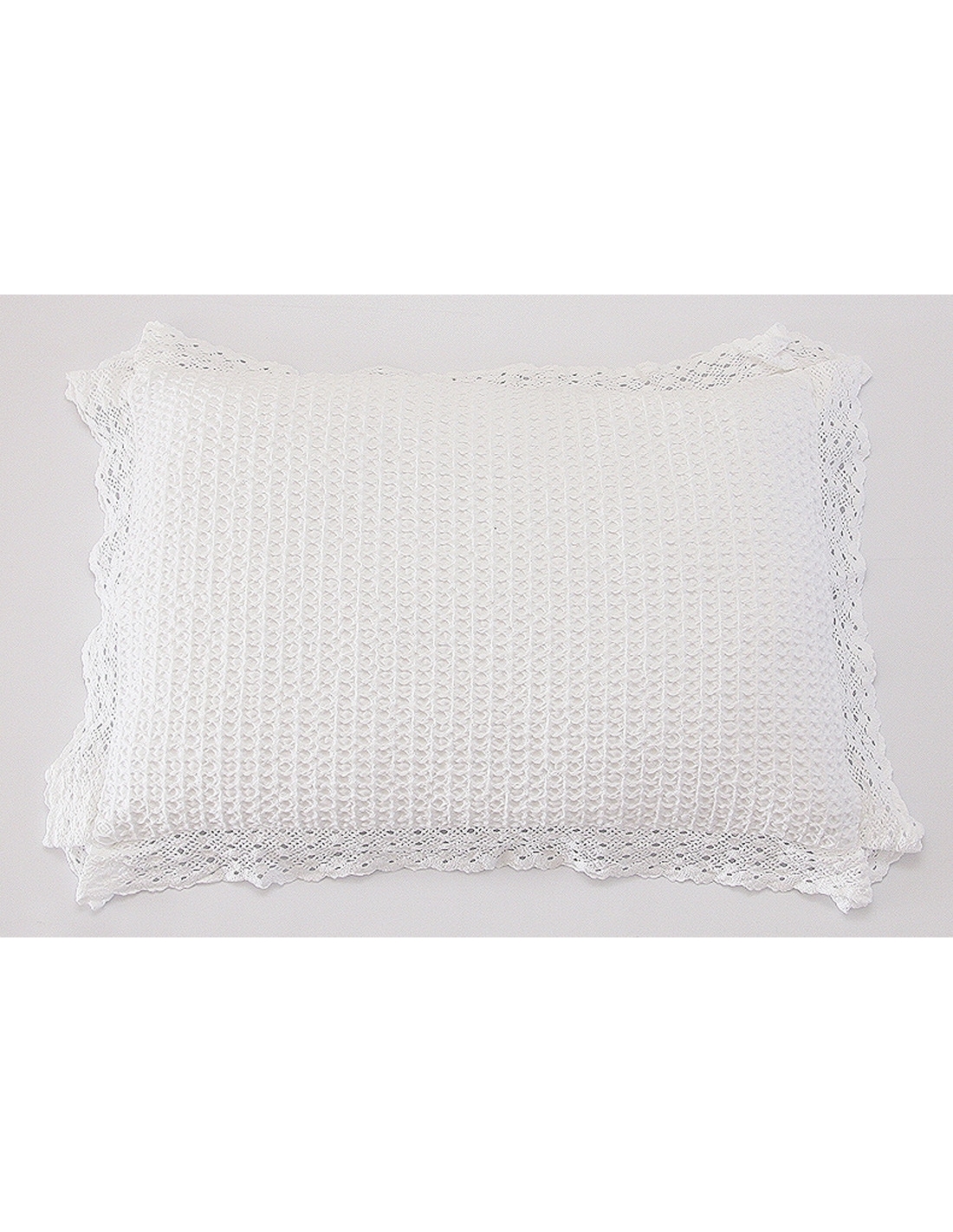 Almofada em tecido de favo, com aplicação de renda em 4 lados, lavada com pre-encolhimento, o que torna muito agradavel, suave e comoda pois não fica marcada e assim não precisa de ser passada a ferro!!!