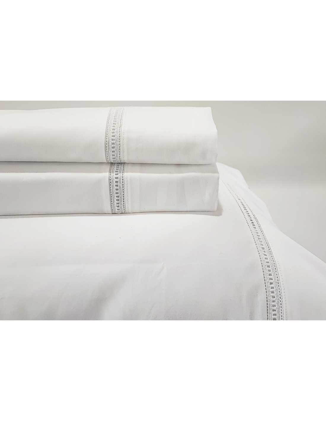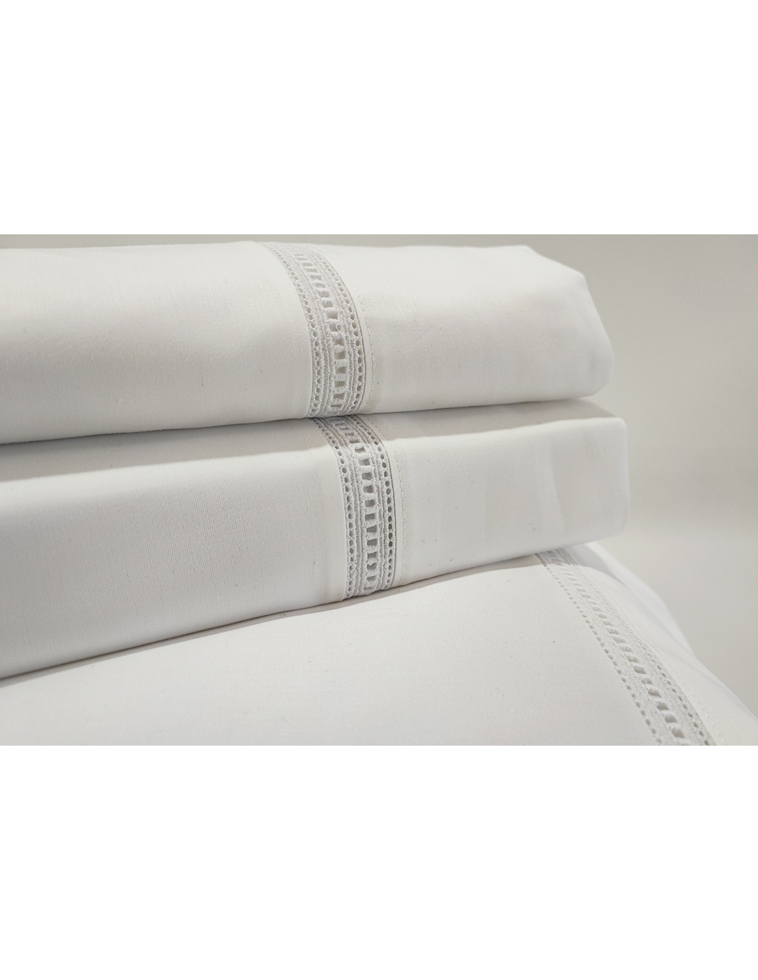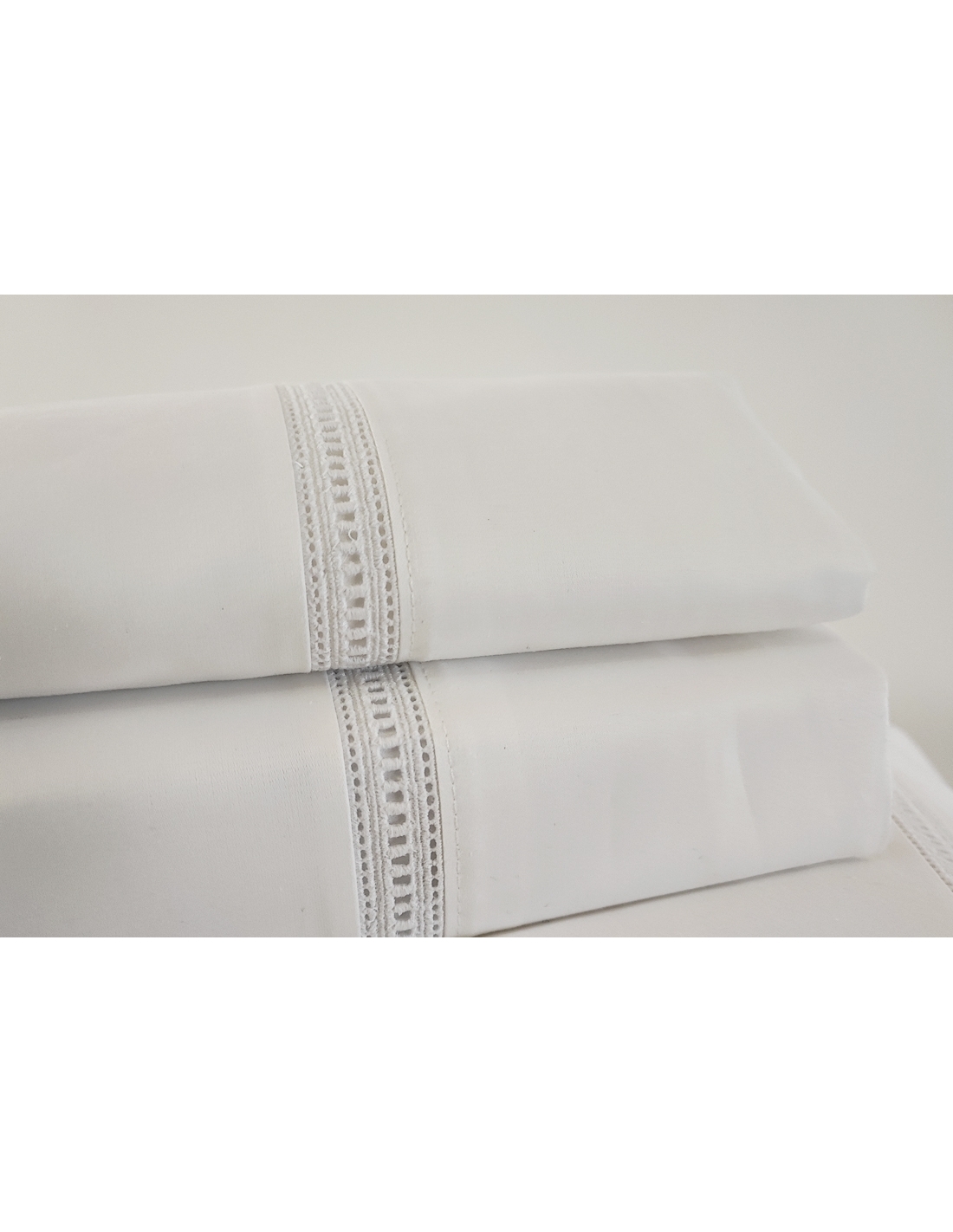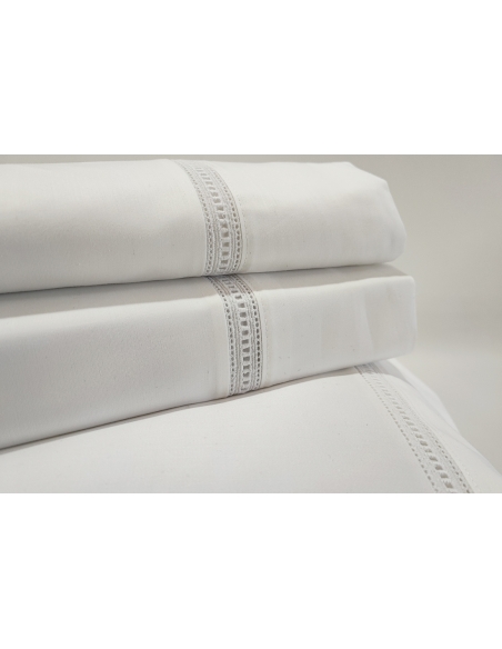 Lençóis em 100% algodão penteado e mercerizado cetim 1000 fios, com tira bordada aplicada sobre uma pala de 11cm que lhe confere leveza e elegância, sem perder a simplicidade.