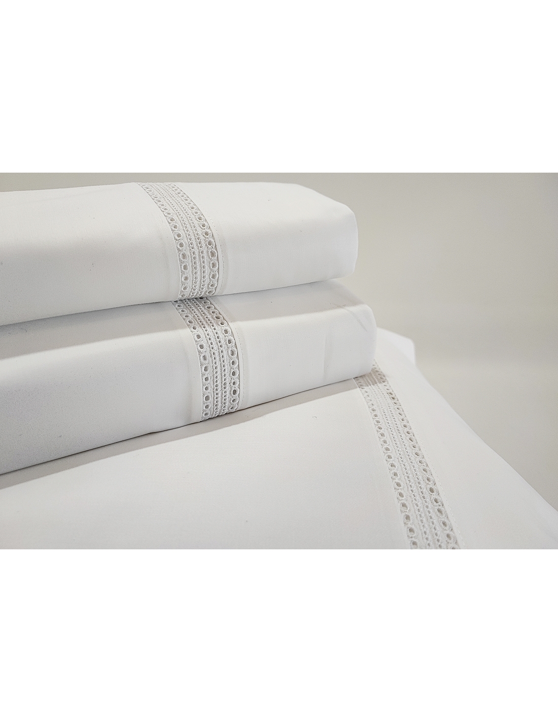 Lençóis em 100% algodão penteado e mercerizado cetim 1000 fios, com tira bordada aplicada sobre uma pala de 11cm que lhe confere leveza e elegância, sem perder a simplicidade.