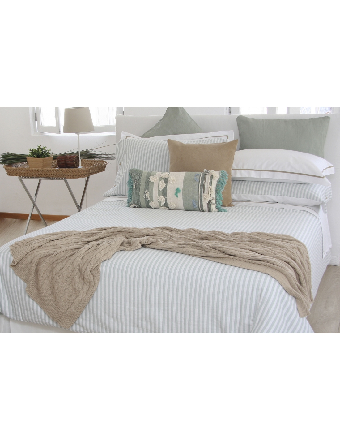Saco de edredão com desenho de riscas e avesso liso branco, assim como as respetivas almofadas. Permite dormir com o lado liso e decorar com o lado estampado.