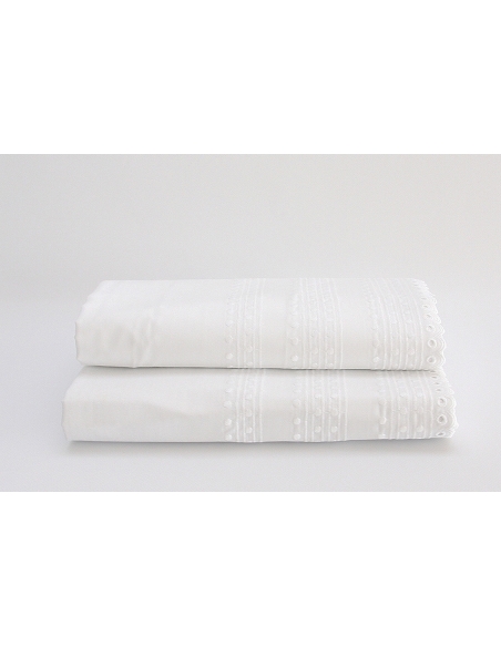 Lençol de cima e almofadas bordados. As almofadas têm aplicação do bordado nos dois lados e fecham com uma aba.