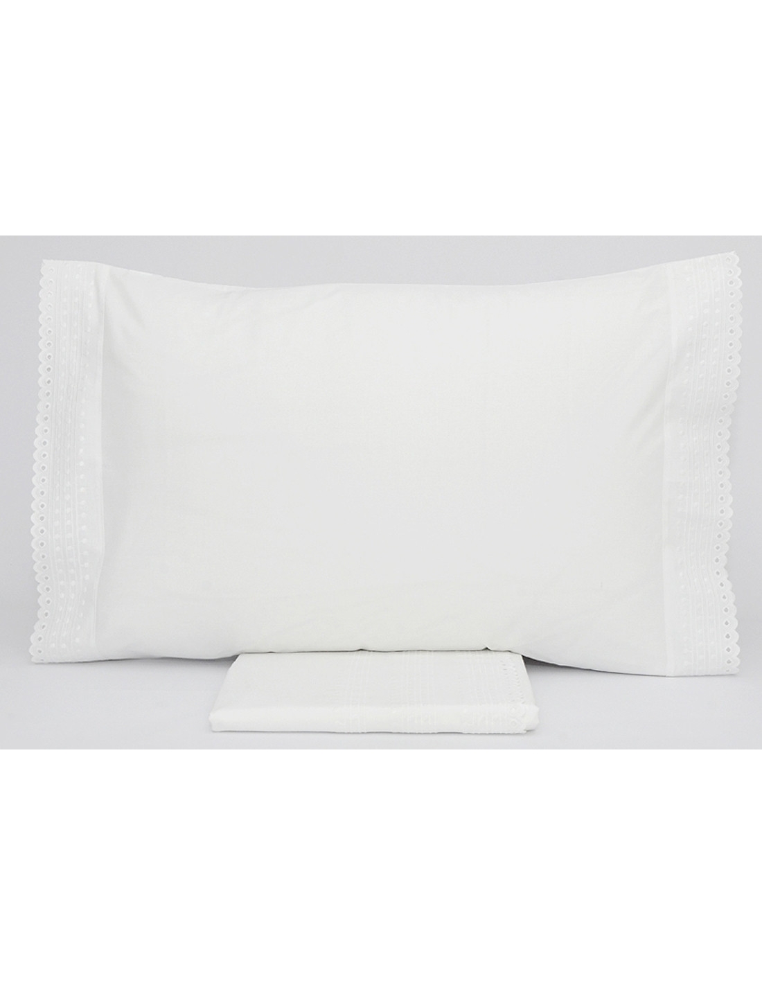 Lençol de cima e almofadas bordados. As almofadas têm aplicação do bordado nos dois lados e fecham com uma aba.
