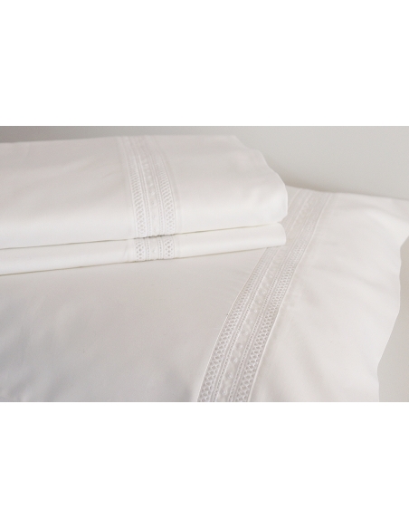 Lençol de cima e almofadas com aplicação de entremeio. As almofadas têm aplicação nos dois lados e fecham com duas abas.