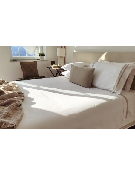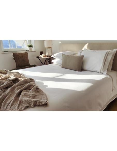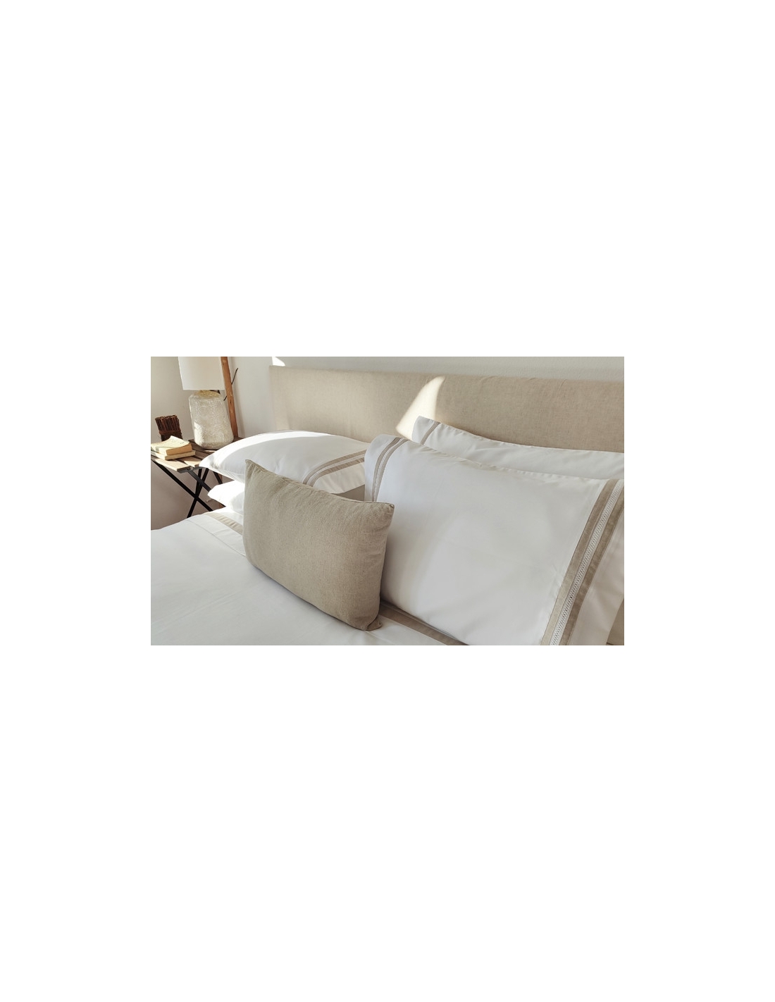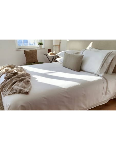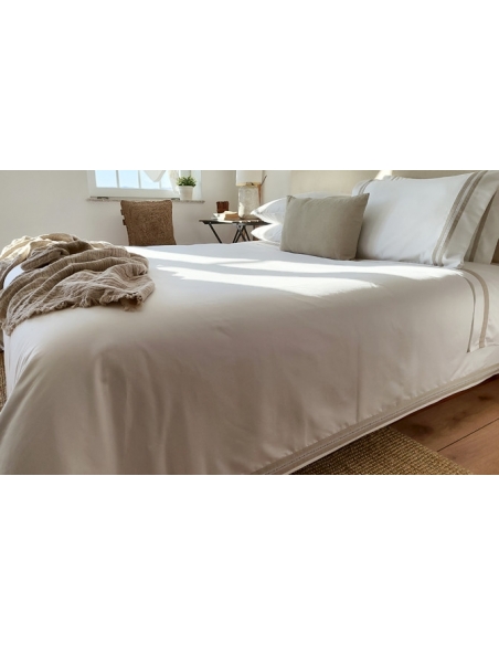 Saco de edredão em algodão de cetim 500 fios e com aplicação de bordado a toda a volta. As almofadas são lisas com aplicação do bordado nos dois lados e fecham com uma aba.