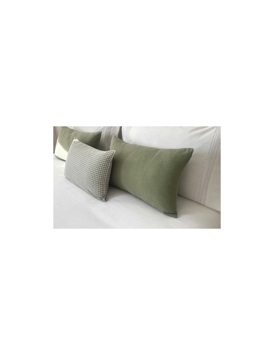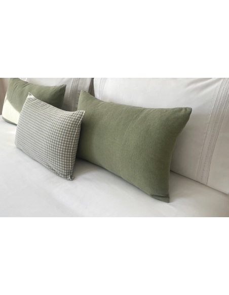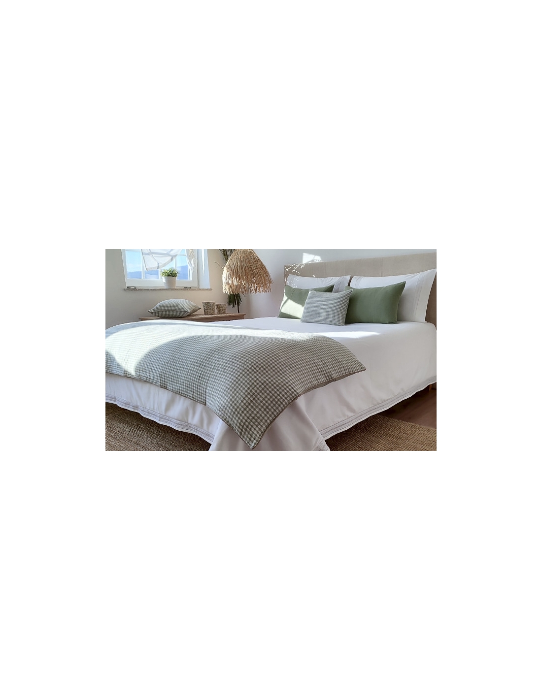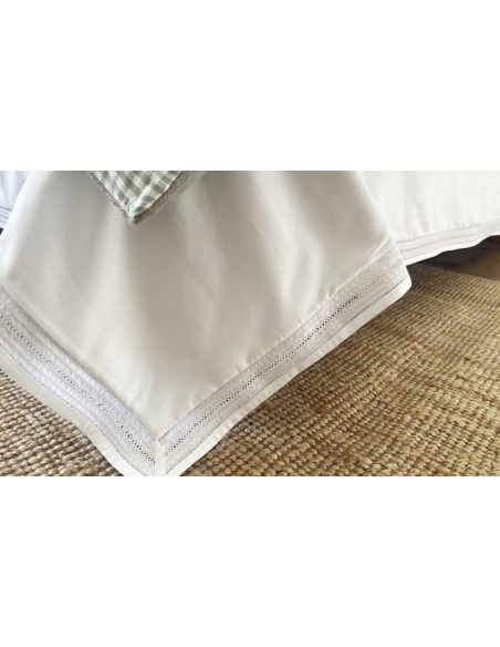 Saco de edredão em algodão de cetim 1000 fios e com aplicação de bordado a toda a volta. As almofadas são lisas com aplicação do bordado nos dois lados e fecham com uma aba.