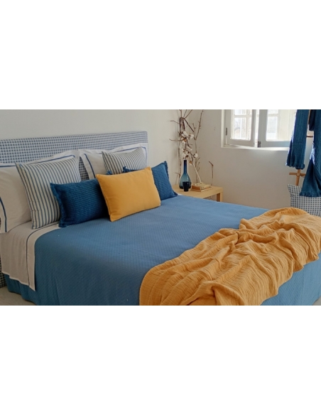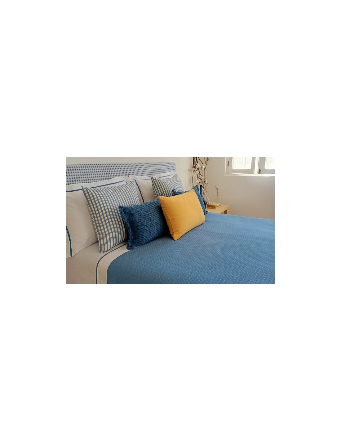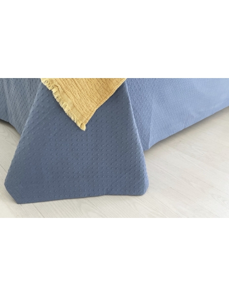 Colcha em algodão com textura de piqué e bolinhas em relevo. Acabamento com esquinas cortadas e confeção a quatro agulhas.