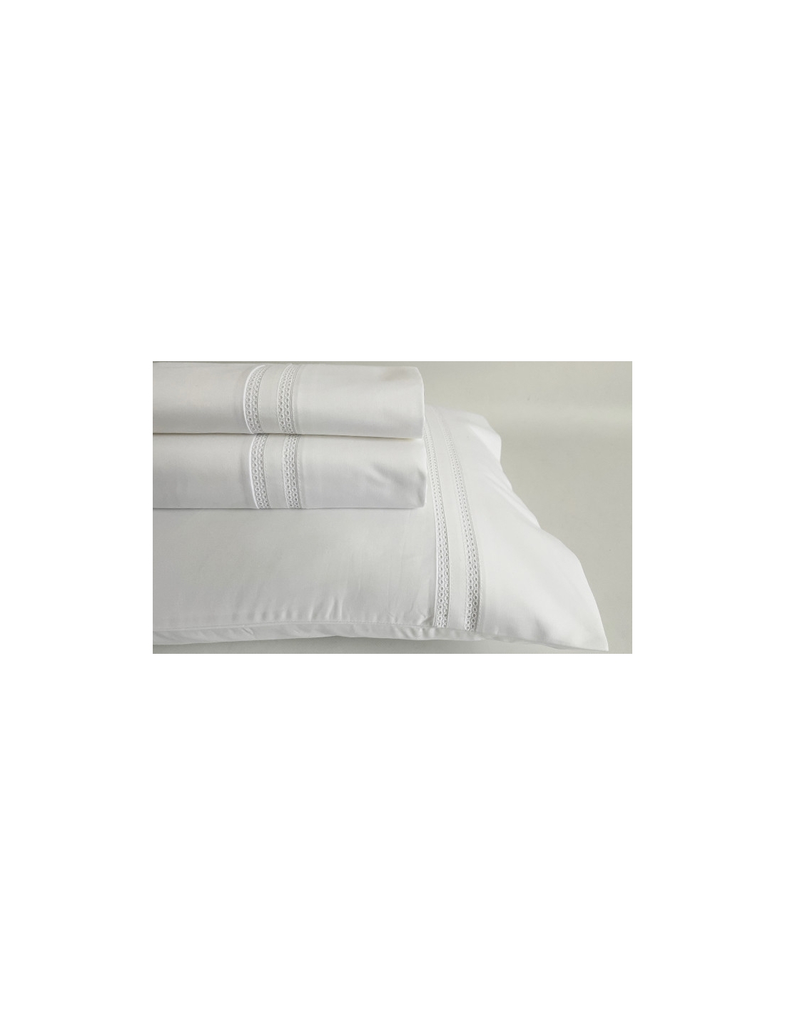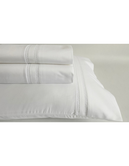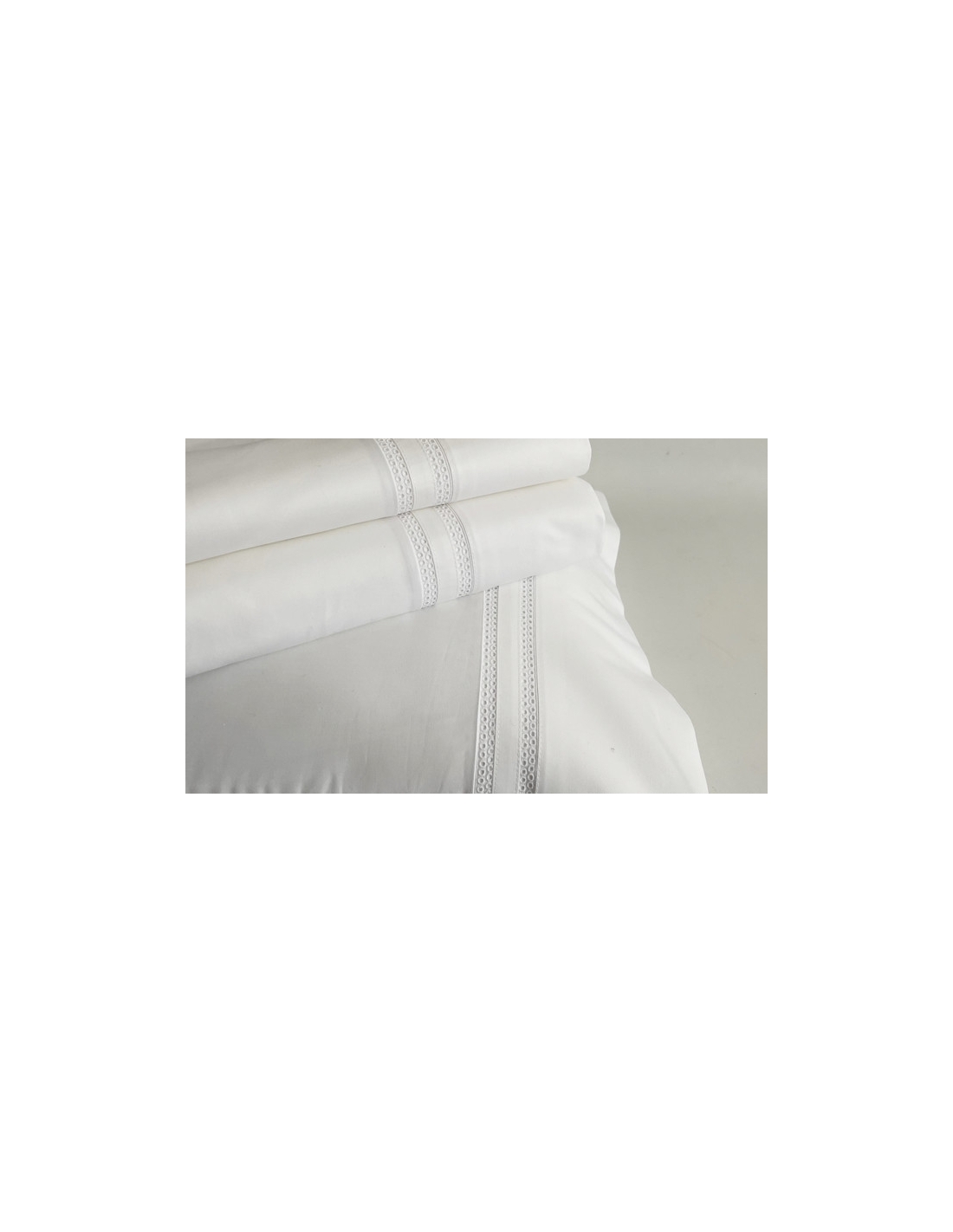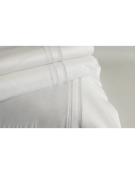 Lençóis em 100% algodão penteado e mercerizado cetim 1000 fios, com tira bordada aplicada com cor branco no entremeio sobre uma pala de 11cm que lhe confere leveza e elegância, sem perder a simplicidade.