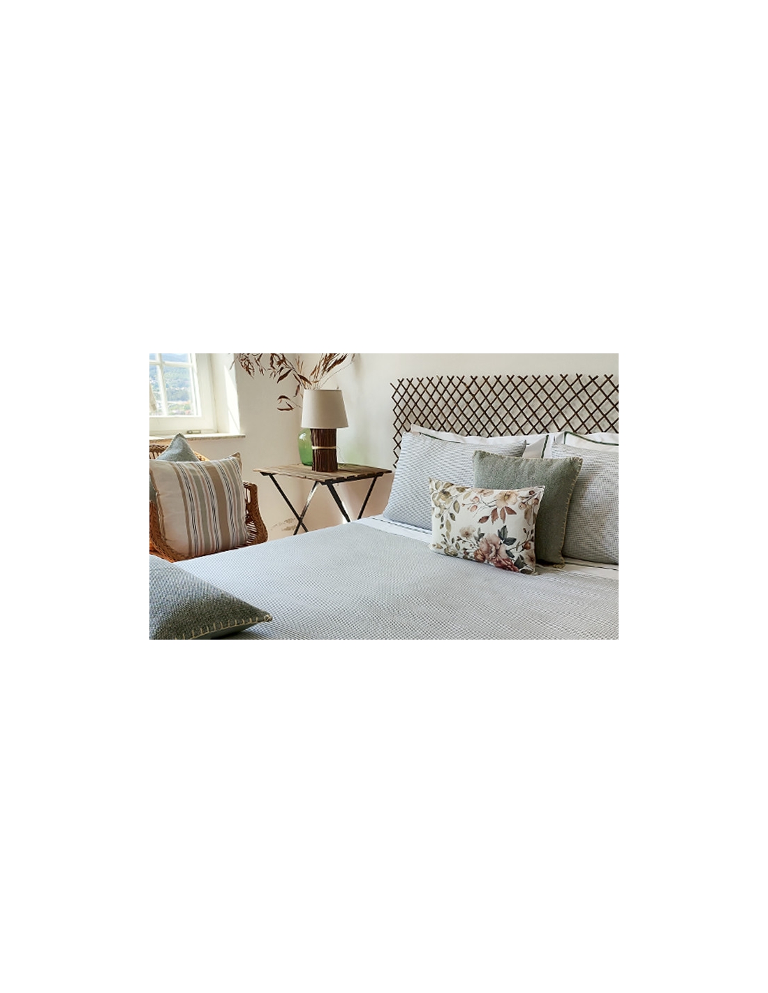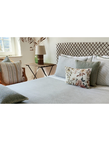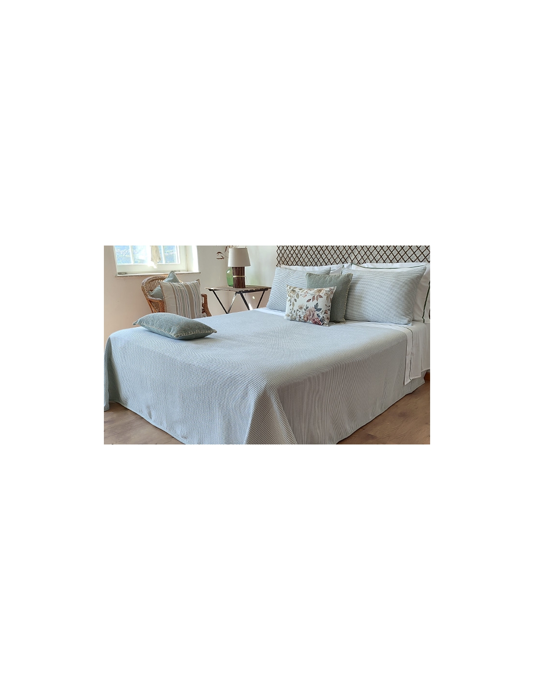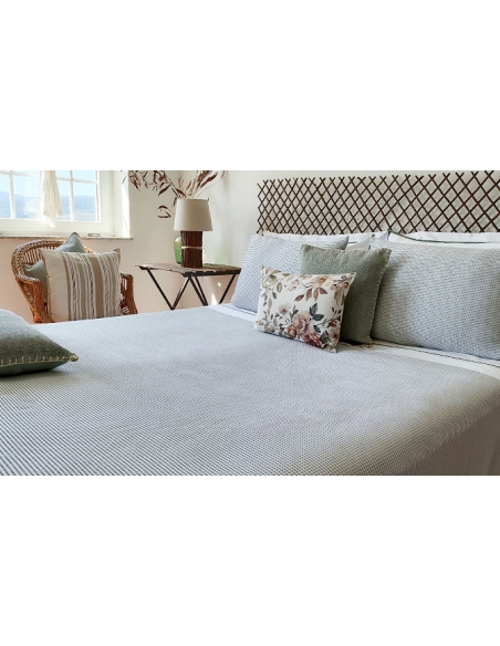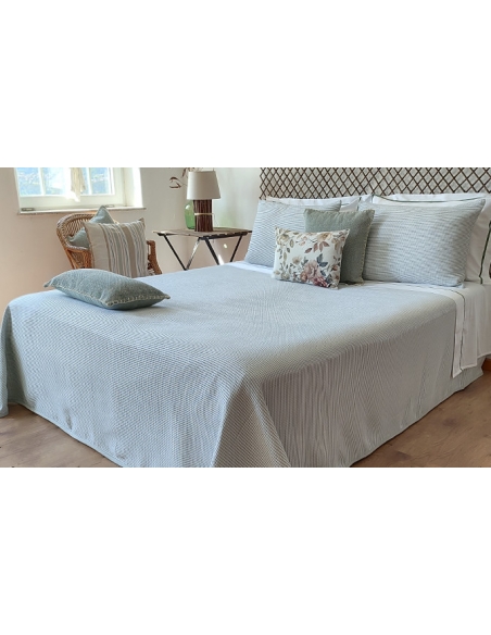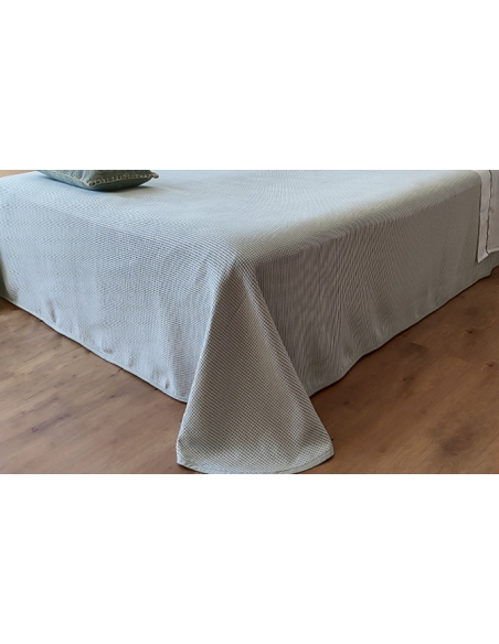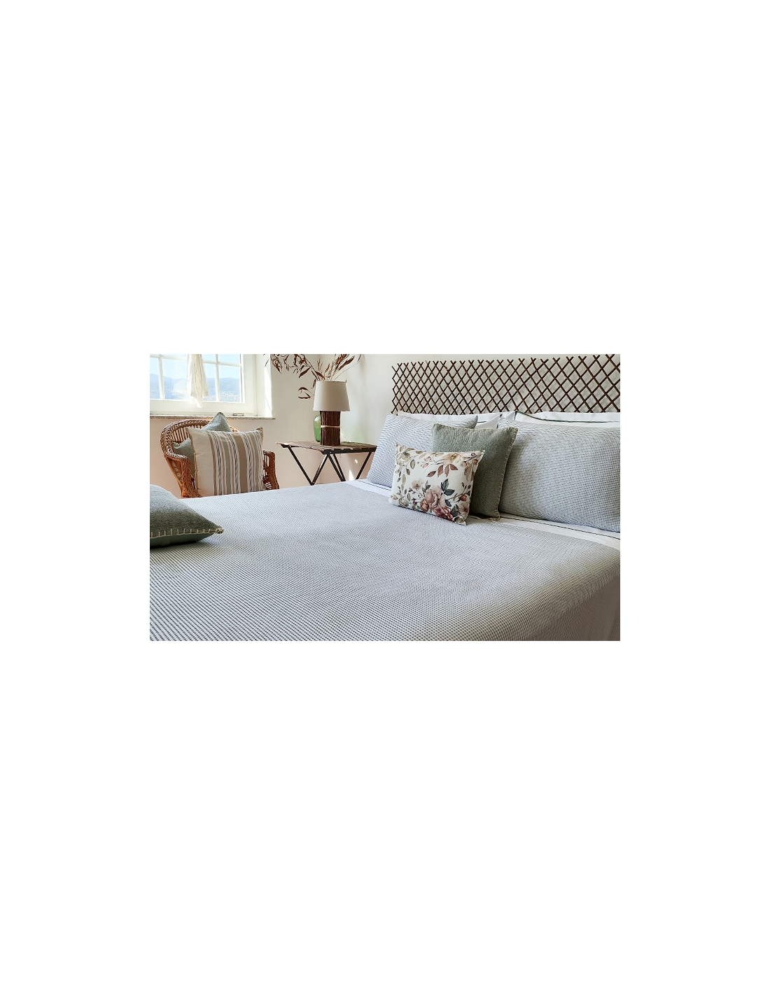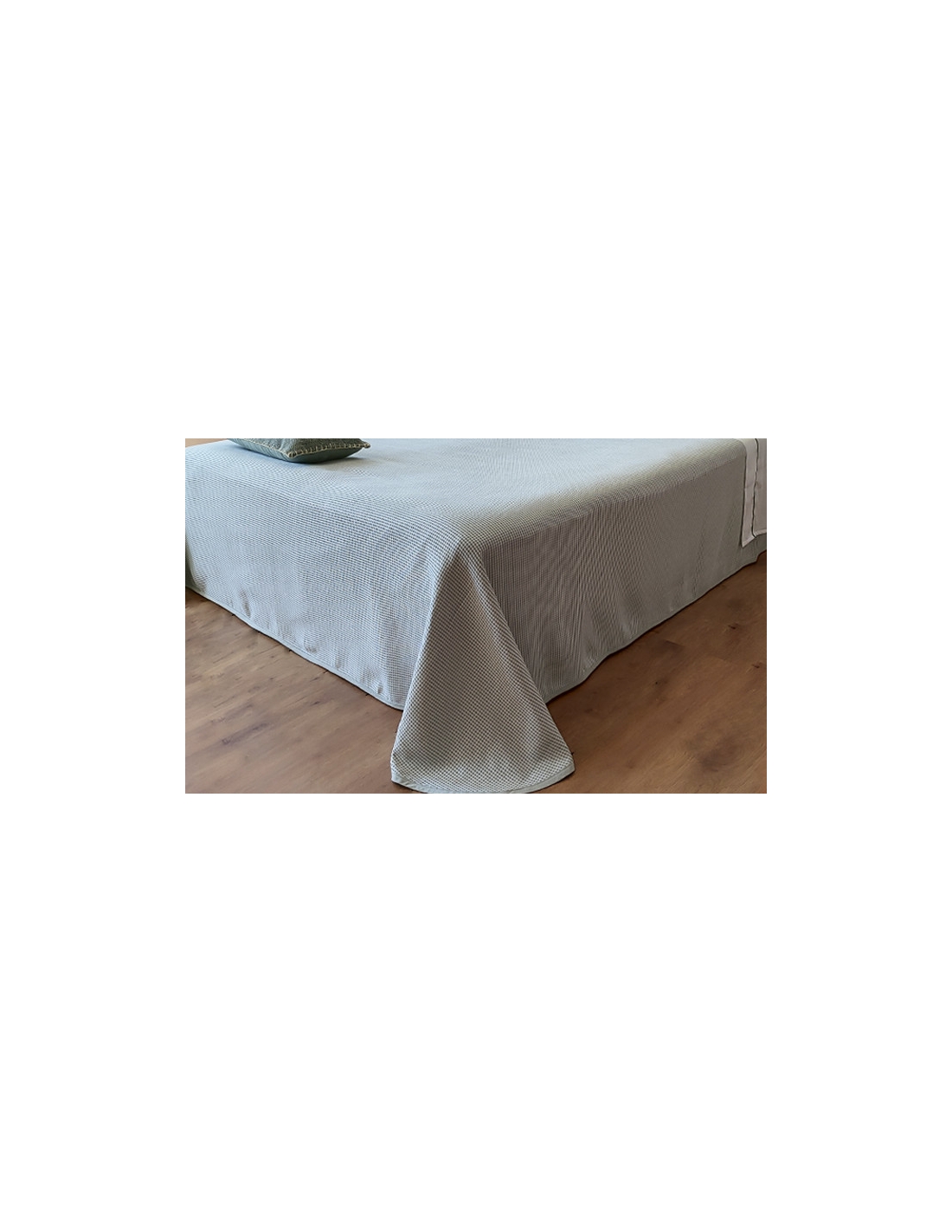 Colcha em algodão com textura de piqué. Acabamento com esquinas redondas.