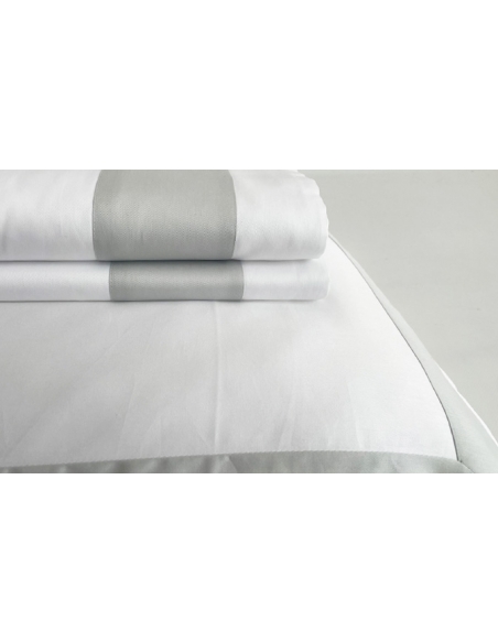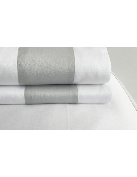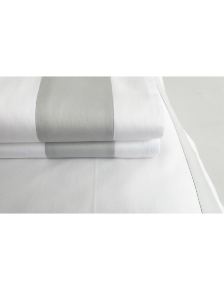 Lençol de cima e almofadas com aplicações de barra de cor no mesmo tecido. As almofadas têm aplicação nos três lados e fecham com uma aba.