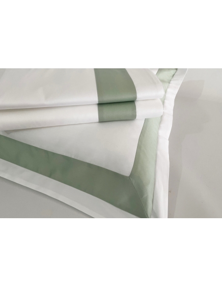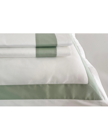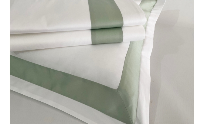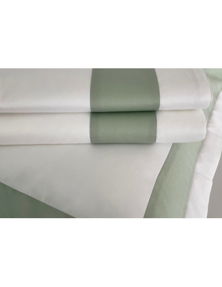 Lençol de cima e almofadas com aplicações de barra de cor no mesmo tecido. As almofadas têm aplicação nos três lados e fecham com uma aba.