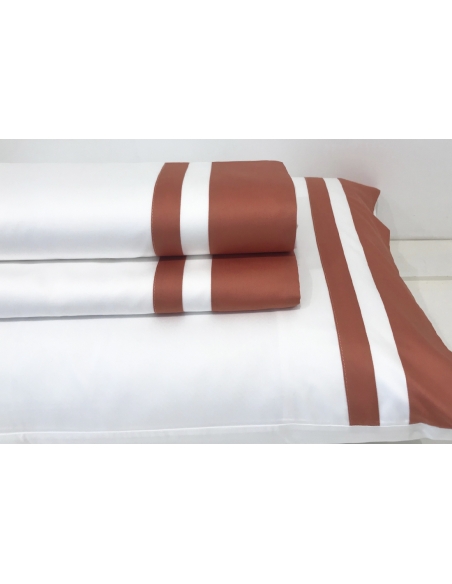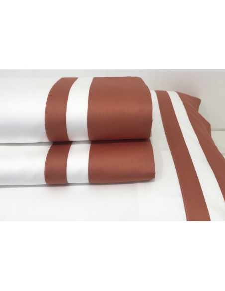 Lençol de cima e almofadas com aplicações de barras de cor no mesmo tecido. As almofadas têm aplicação nos dois lados e fecham com duas abas.