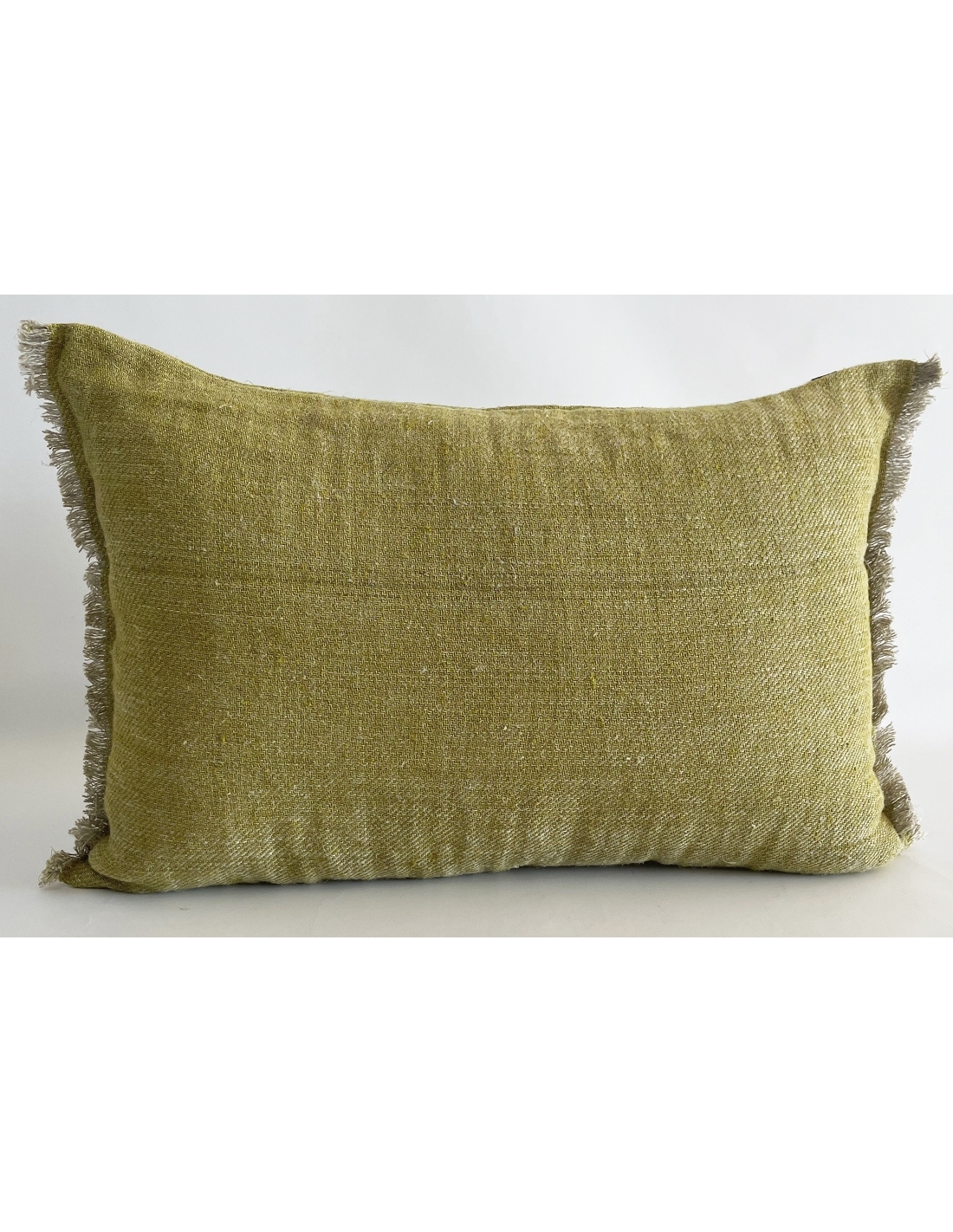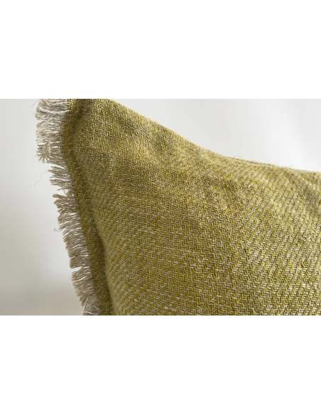 Capa de almofada com franjas nas extremidades. É reversível e possui fecho éclair num dos lados.