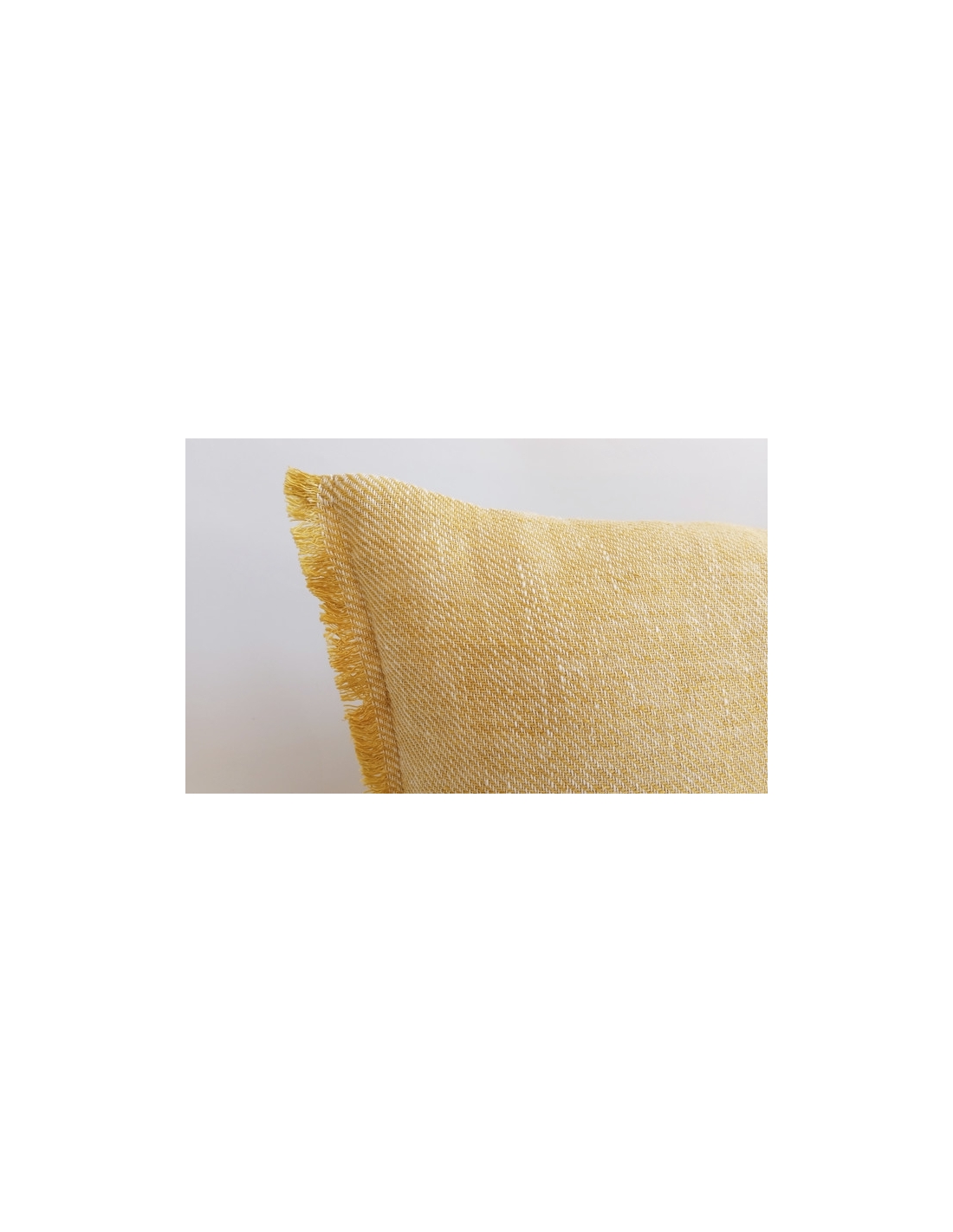 Capa de almofada com franjas nas extremidades. É reversível e possui fecho éclair num dos lados.