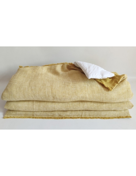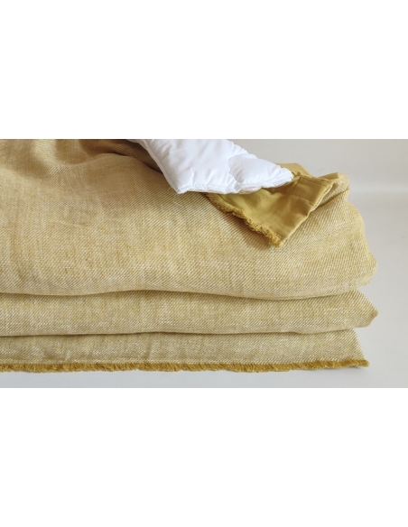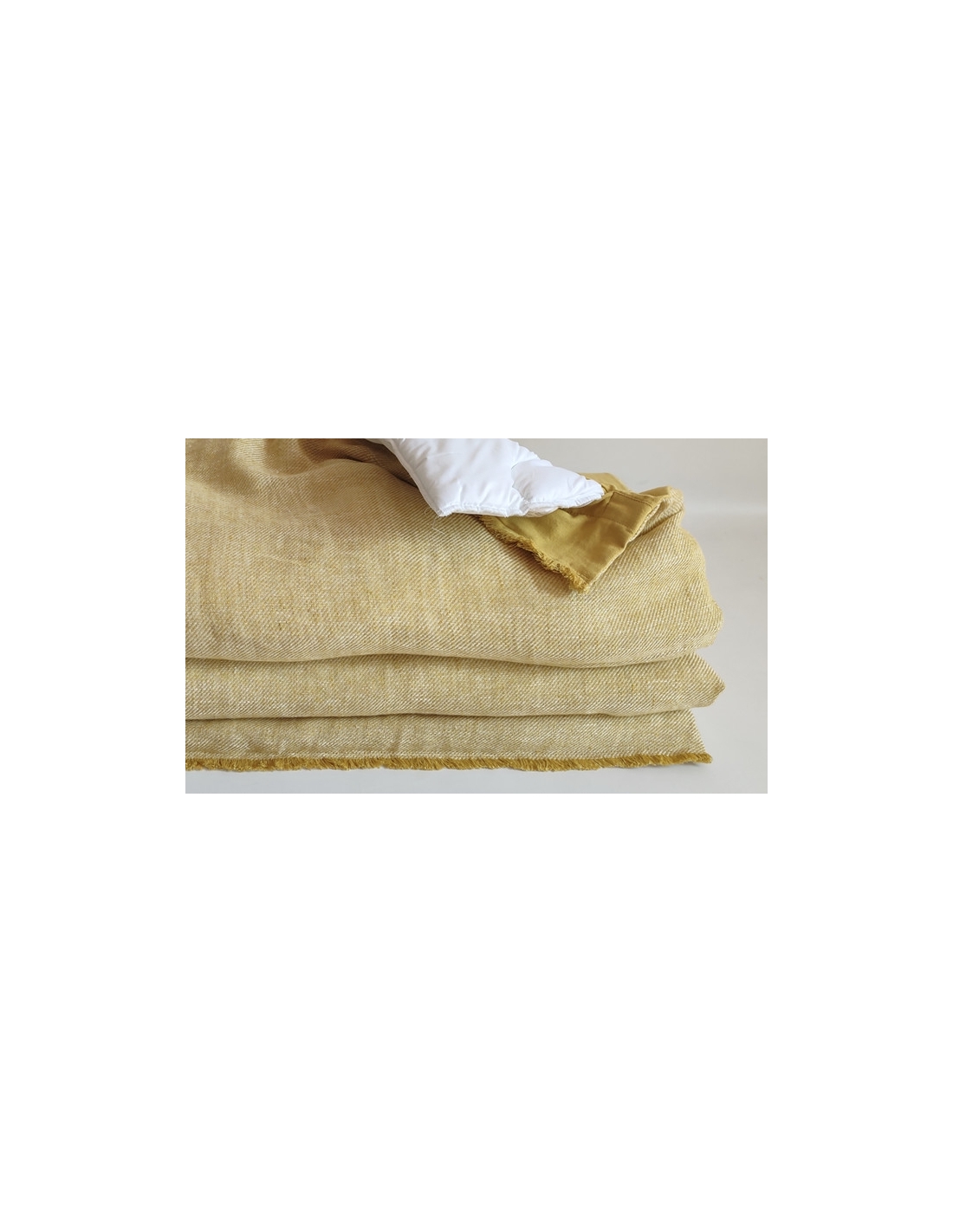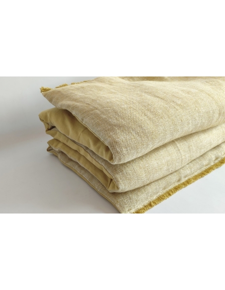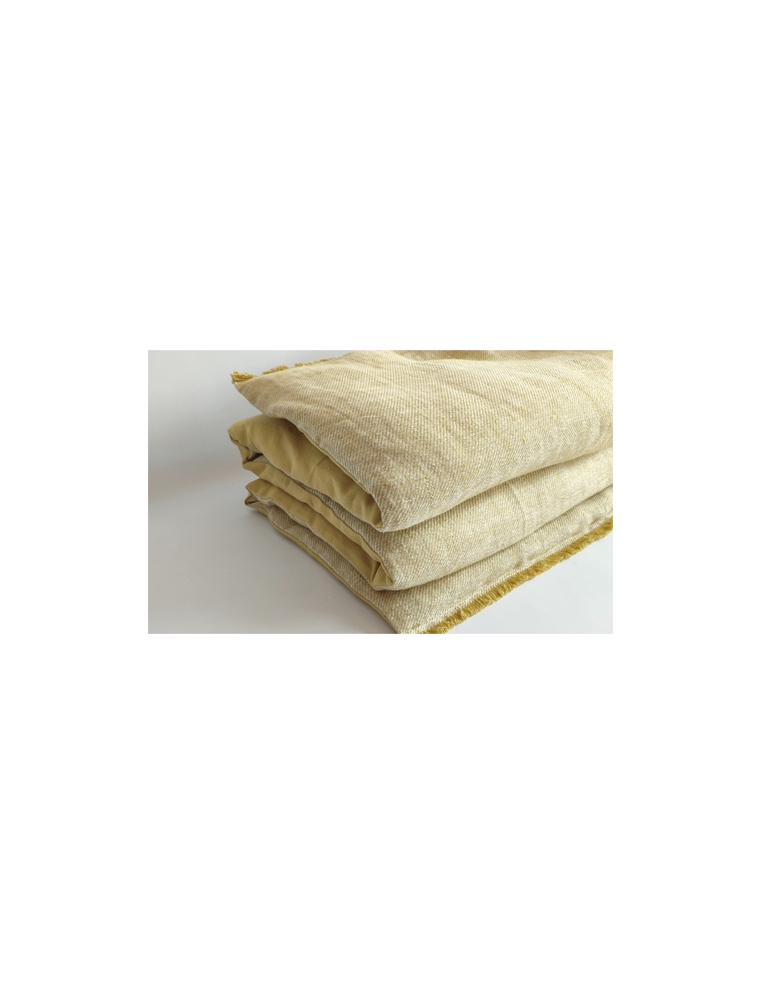 Plaid com duas faces, um lado em linho e outro em algodão. Possui franja nas duas extremidades e fecho no avesso para introduzir ou retirar o recheio.