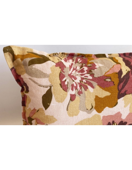 Capa de almofada estampada, com verso liso em verde e fecho na parte traseira.