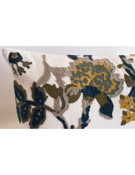 Capa de almofada com frente bordada e verso liso na cor de fundo.