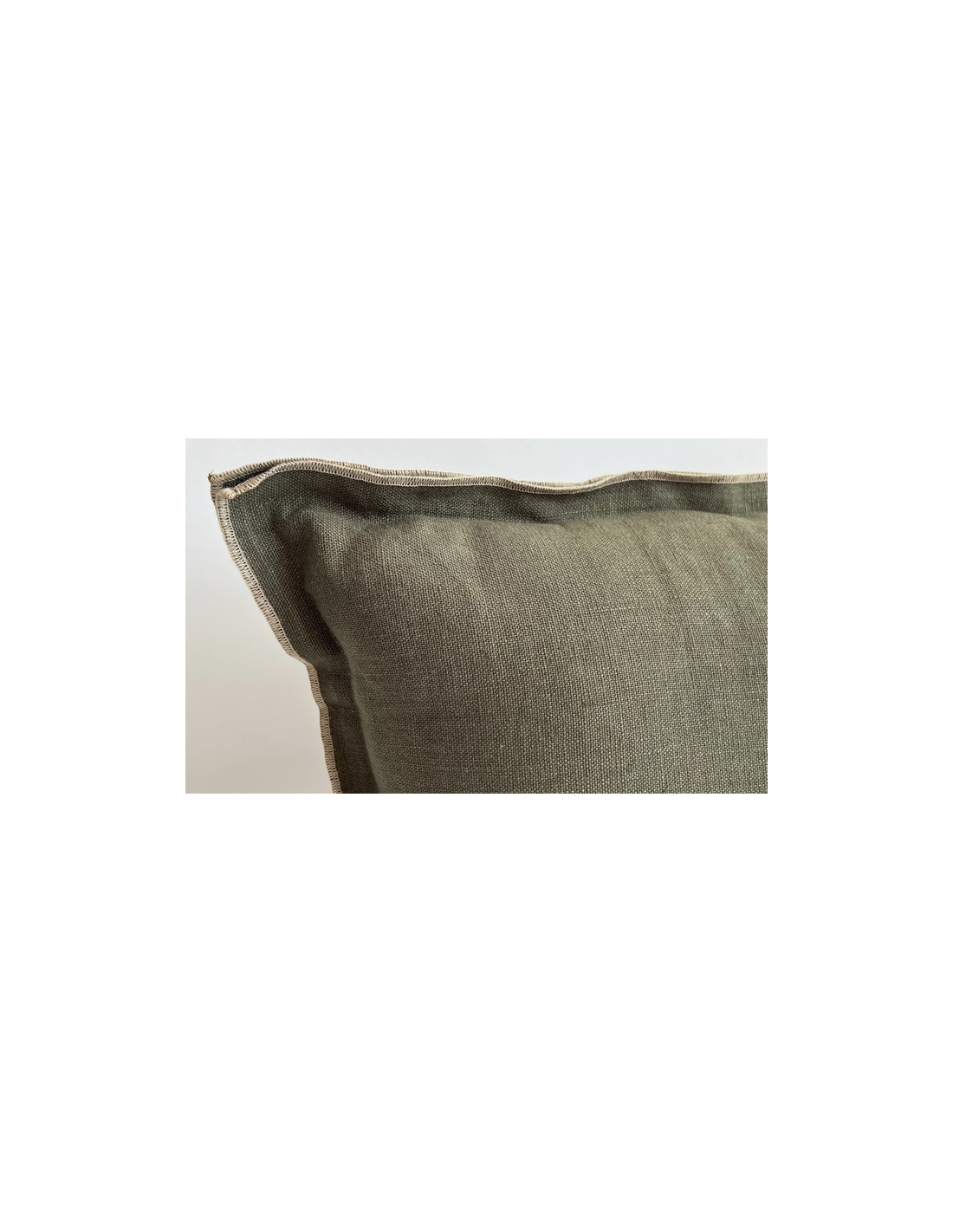 Capa de almofada lisa em linho, com costura interior que delimita o formato, rematada por uma aba dupla com viés em contraste a toda a volta.