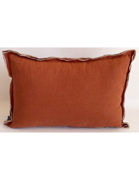 Capa de almofada lisa em linho, com costura interior que delimita o formato, rematada por uma aba dupla com viés em contraste a toda a volta.
