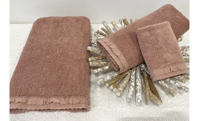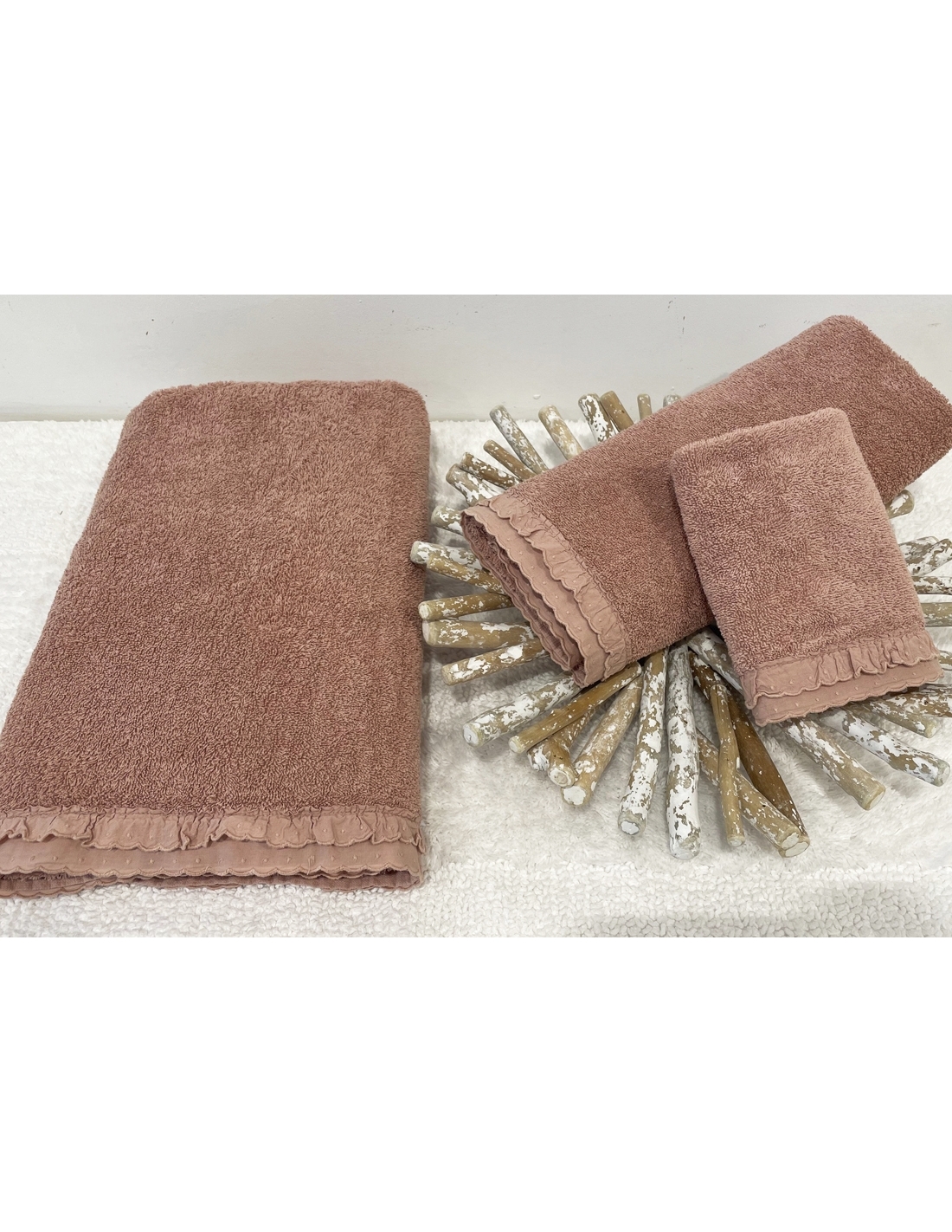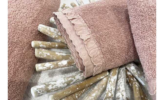Jogo de toalhas em felpo rosa com bordado inglês na ponta e acabamento em stonewash.