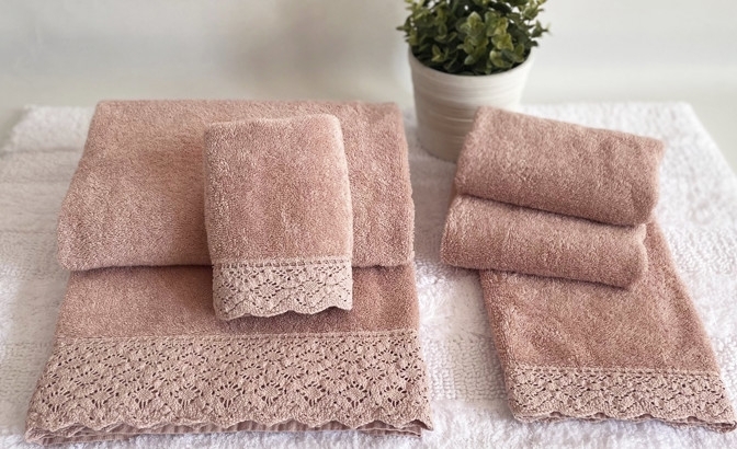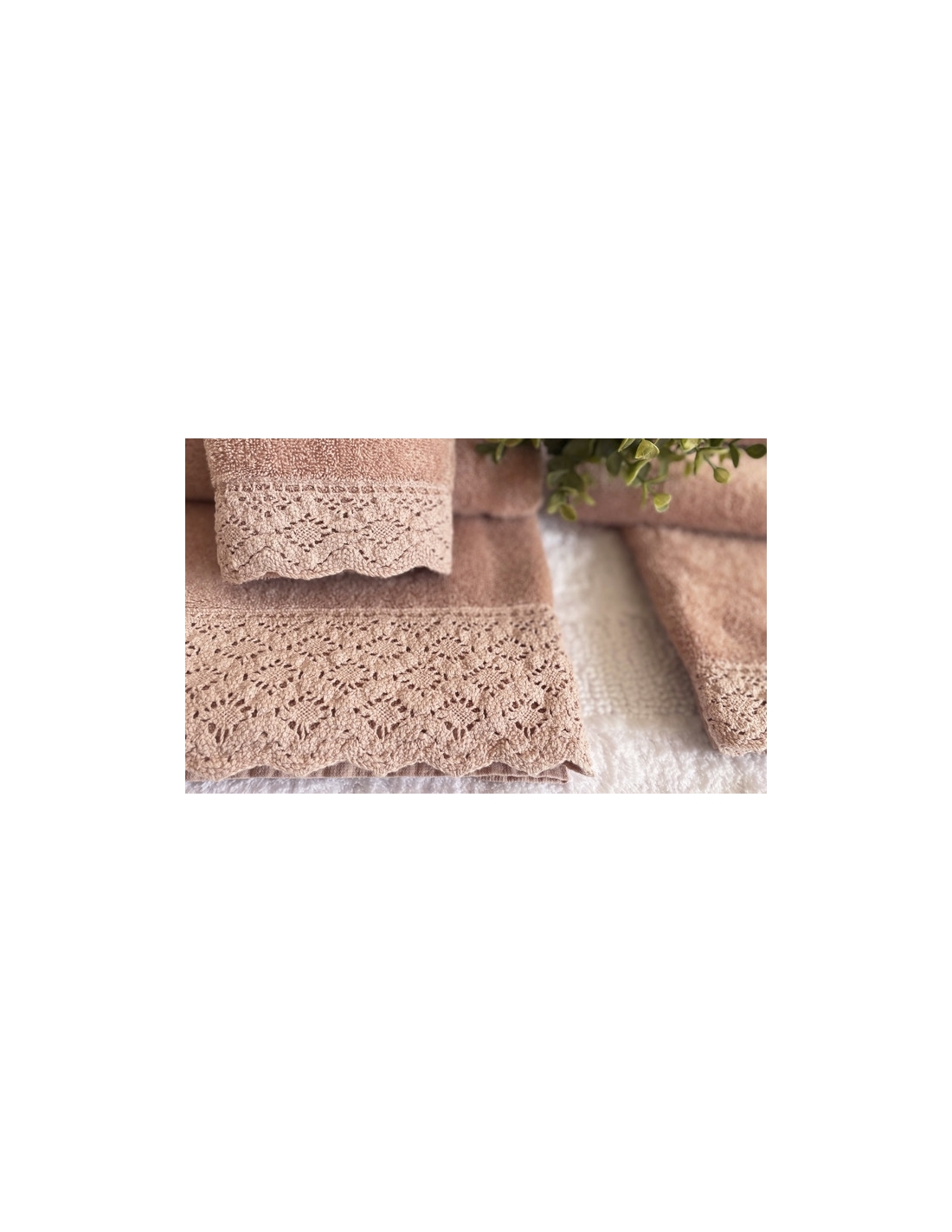 Jogo toalhas de 3 peças com acabamento de renda na extremidade.