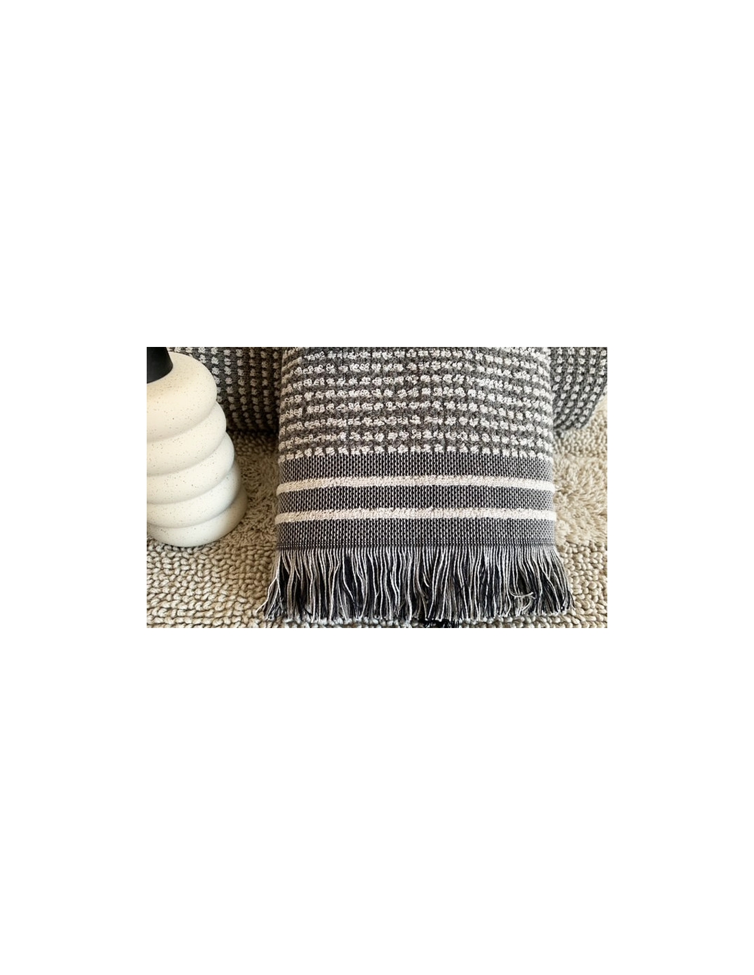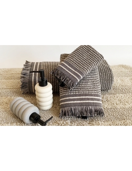 Jogo de toalhas de três peças. O design apresenta um padrão geométrico em azul e bege, com franjas delicadas nas extremidades.