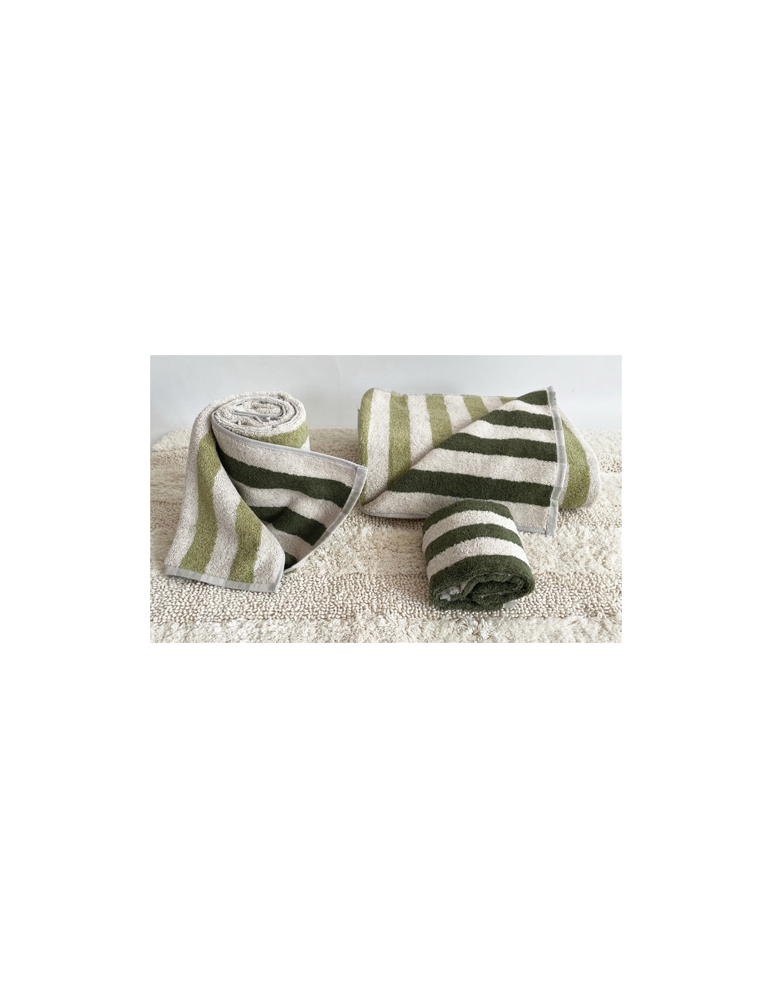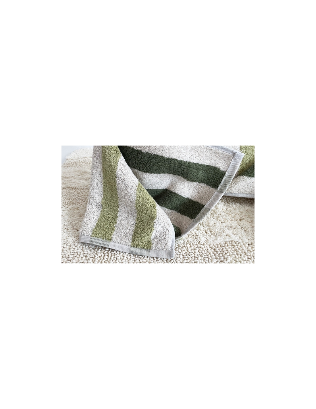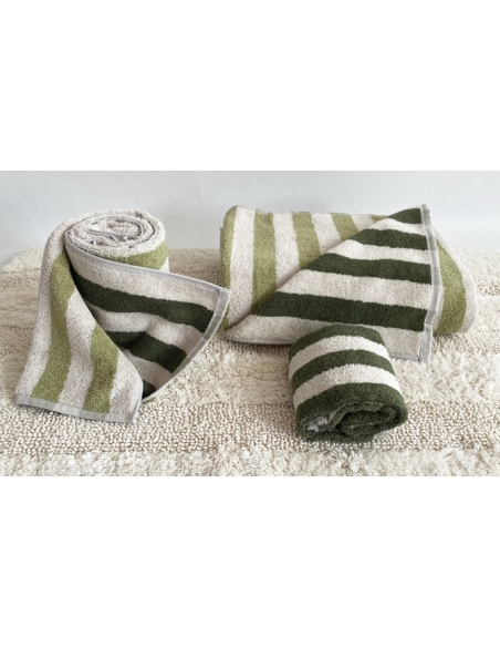Jogo de toalhas em algodão de elevada qualidade, reversível com riscas largas em tons de verde e bege que conferem um toque natural e contemporâneo à casa de banho.