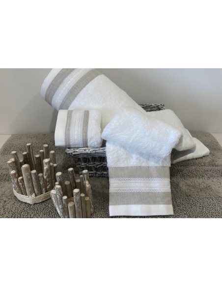 Jogo de toalhas com aplicação de duas tiras de tecido com bordado no meio.