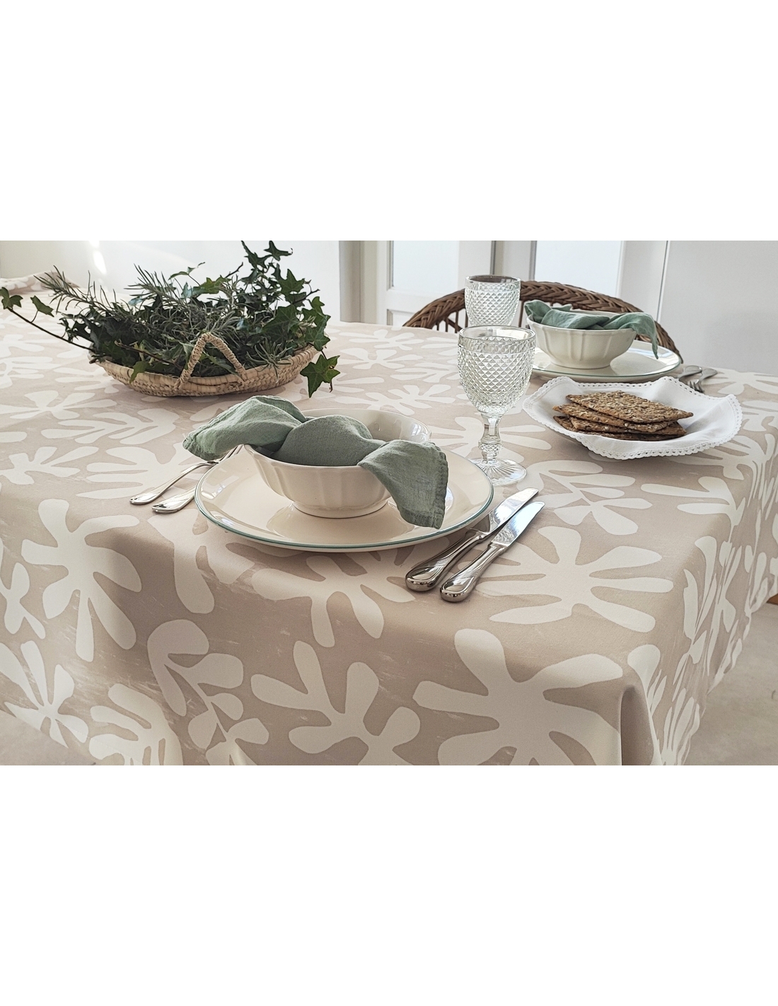 Toalha de mesa estampada com tratamento anti-mancha e antiruga.
