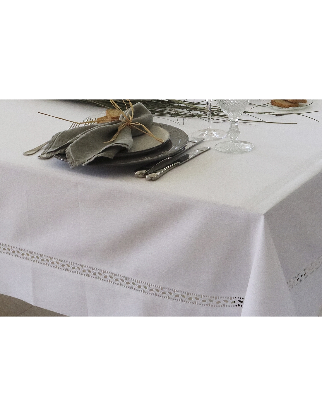 Toalha de mesa lisa com aplicação de bordado a toda a volta.