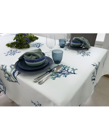 Toalha de mesa estampada com tratamento anti-mancha e antiruga.