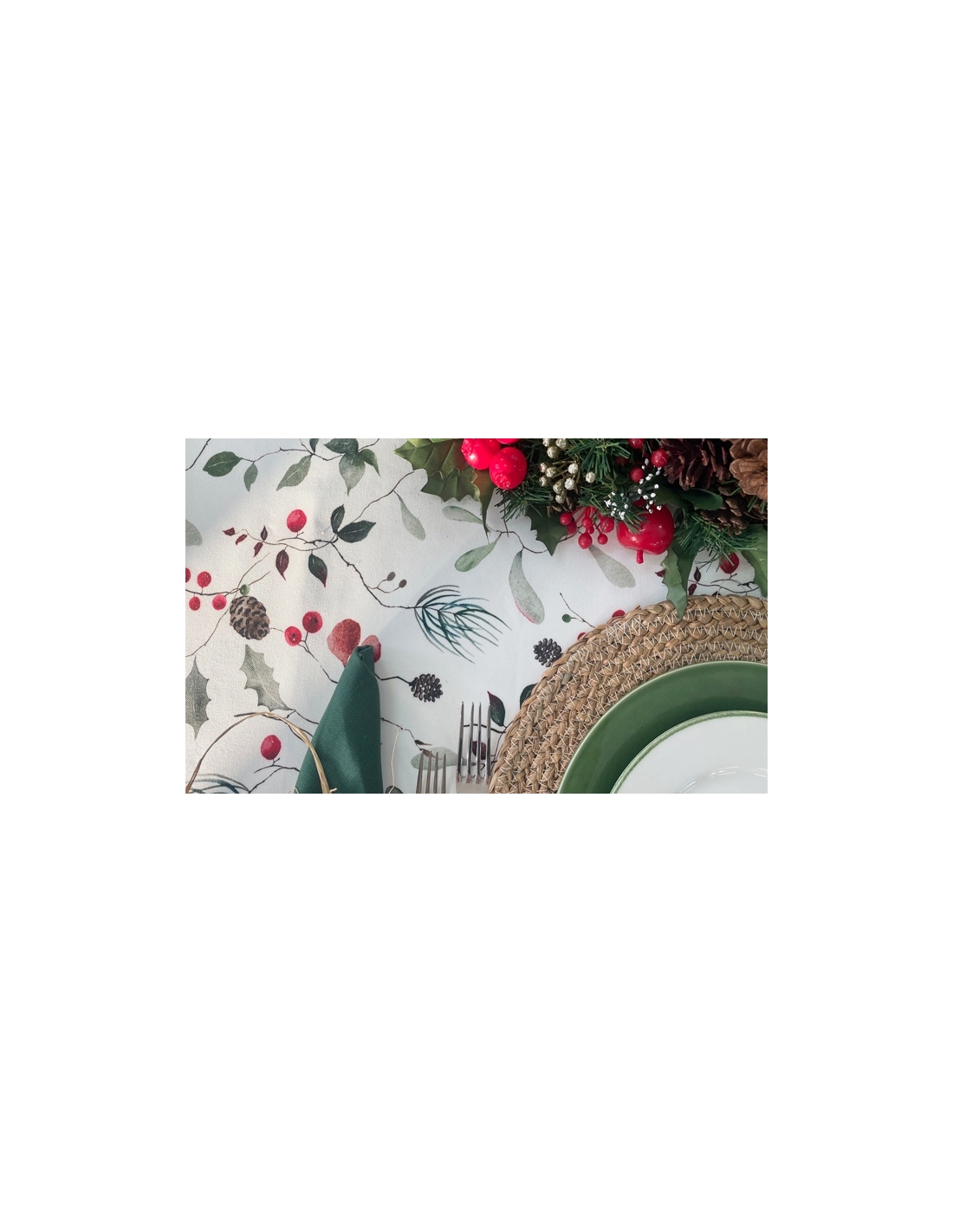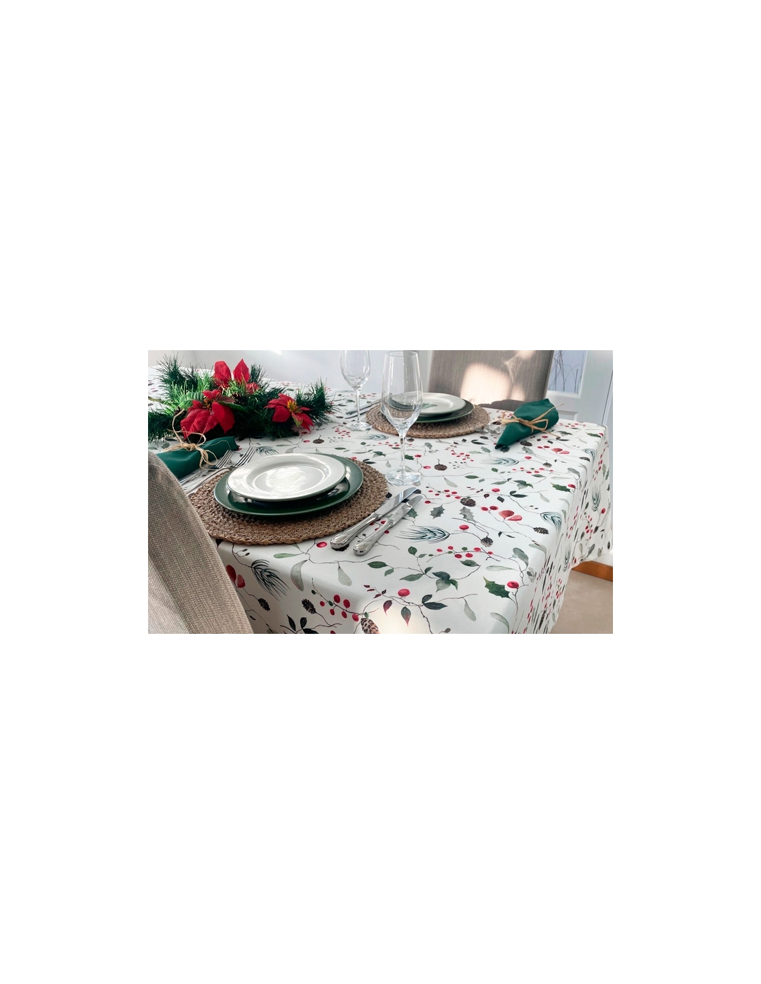 Toalha de mesa estampada com tratamento anti-mancha e antiruga.