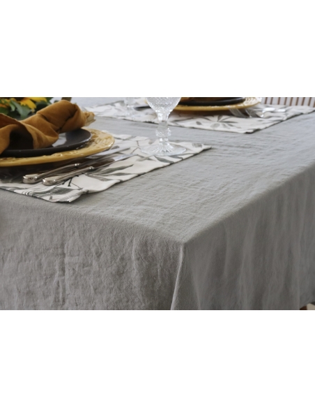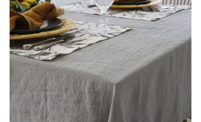 Toalha de mesa 100% linho com design liso e acabamento lavado com tingimento em garment wash.
