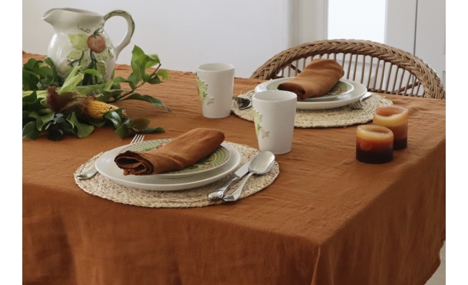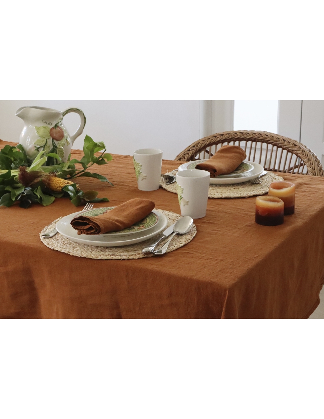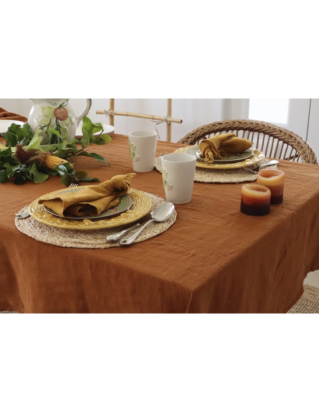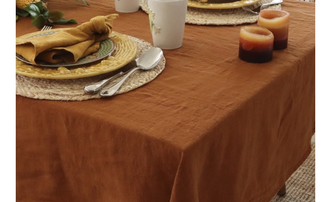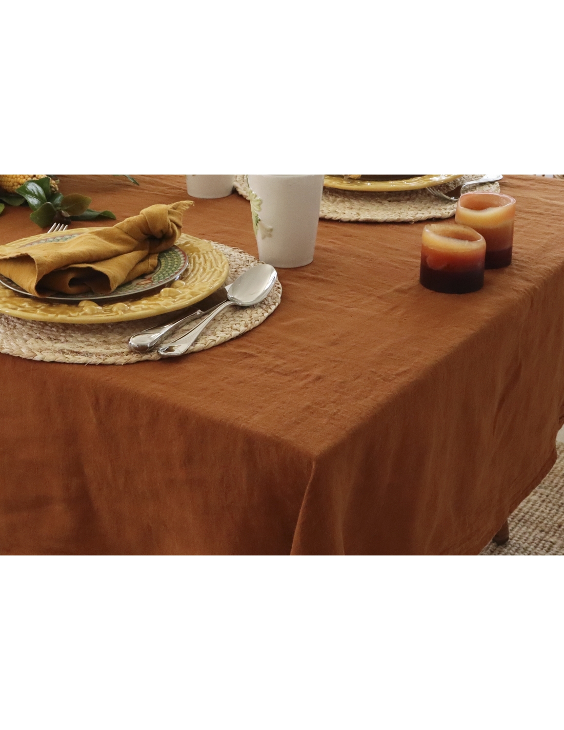Toalha de mesa 100% linho com design liso e acabamento lavado com tingimento em garment wash.