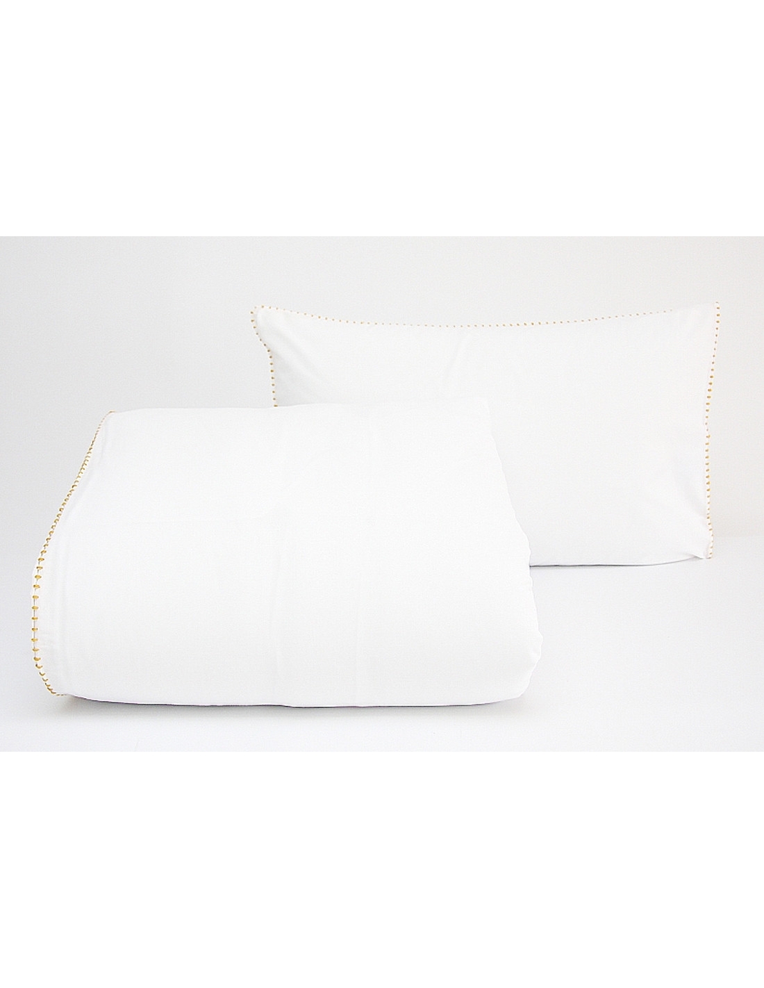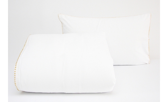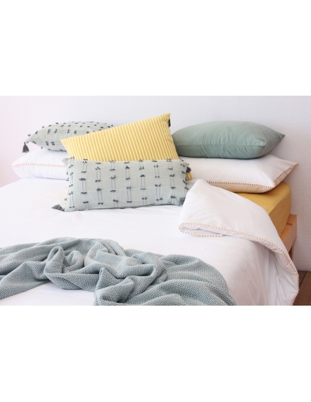 Saco de edredão e almofadas lisas com pesponto de cor à volta. As almofadas têm pesponto a toda a volta e fecham com uma aba.