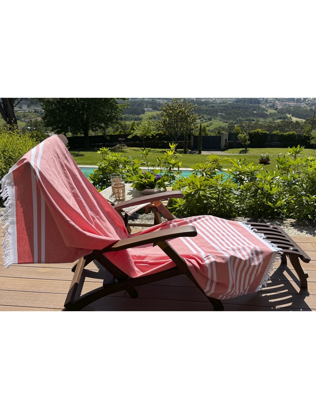 Toalha de praia tipo páreo com felpo no interior. O interior em felpo confere-lhe uma boa capacidade de absorção da água e o seu tecido fino em algodão torna-a macia ao toque, confortável e de secagem rápida.